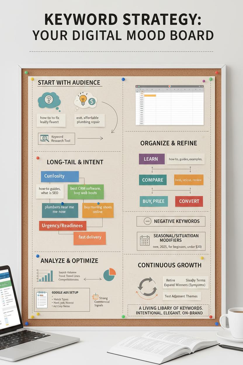 Next, cluster your list by intent: learn (how-to, guides), compare (best, versus), and convert (buy, price, near me). This keeps ad groups tidy and your search engine optimization ad aligned with the exact promise someone is searching for. Sprinkle in negative keywords to protect your budget from irrelevant clicks, and don’t forget seasonal or situational modifiers like for beginners, under $50, or 2025—tiny details that can lift click-through rates in a big way. A few favorite PPC tips: balance head terms with long-tails, cap bids on curiosity-heavy phrases until they prove value, and revisit your search terms report weekly to promote surprise performers into your main clusters. If you like a little structured inspo, skim a Google Ads guide or dog-ear pages in your go-to marketing books to spark fresh angles and keyword variations you might have missed. As your campaigns run, feed performance data back into the list—retire sleepy terms, expand winners with synonyms, and keep testing adjacent themes. Over time, you’ll have a living library of keywords that consistently attract the right eyes, stretch your budget, and make every click feel intentional, elegant, and on-brand.