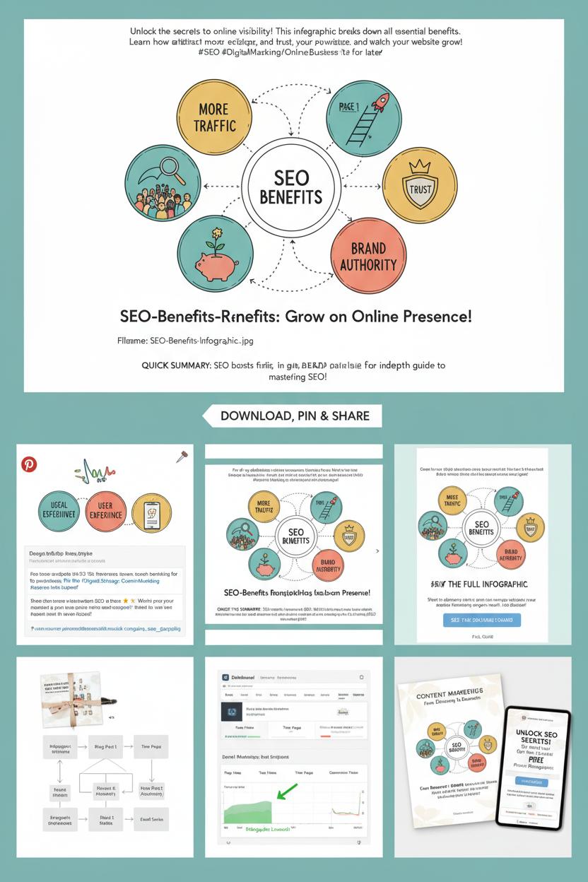 Pin this SEO benefits infographic and learn how search engine optimization can boost website traffic and rankings fast. Discover actionable SEO tips for bloggers, brands, and digital marketing pros— from keyword strategy to on-page tweaks and analytics wins. Pair this visual guide with your favorite SEO book, a keyword research tool, and website analytics software to track progress. Ready to optimize? Use our content marketing guide and run an SEO audit tool to fix issues, build authority, and turn clicks into customers.