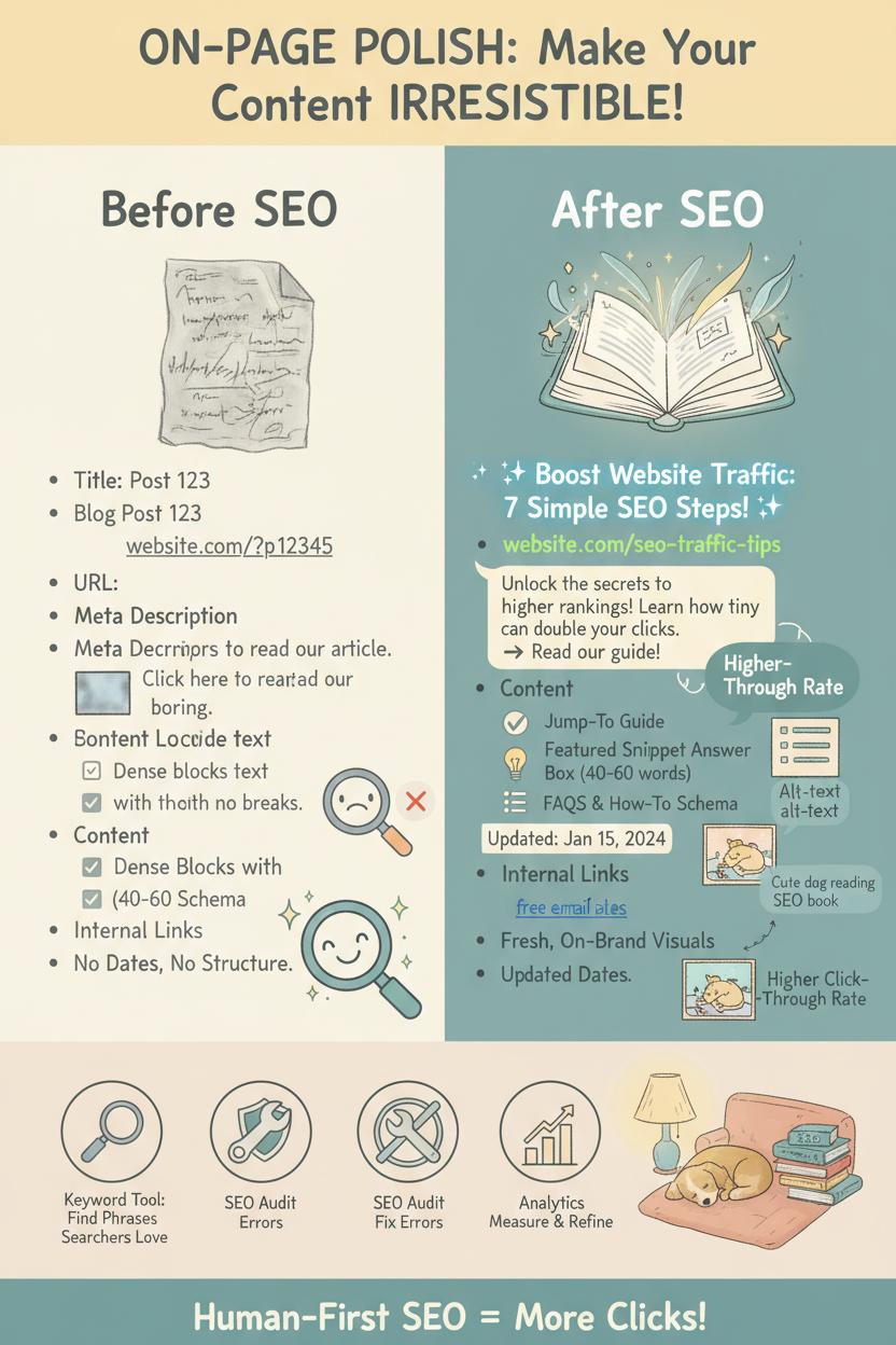 Think of on-page polish as the cozy styling that makes your content irresistible at first glance. The keywords you choose, the way your title sparkles, and how your meta description whispers benefits—all of it nudges more people to click. Start by weaving your primary phrase into the title and the first 100 words in a way that feels organic, then keep the URL short and readable. Promise value in the meta description with a tiny story or outcome and a subtle call to action. Sprinkle descriptive subheads that match search intent, and use alt text that reads like a quick caption rather than a keyword dump. If you’re following along with our SEO benefits infographic, you’ll see how these tiny touches stack up in search engine optimization to boost website traffic.