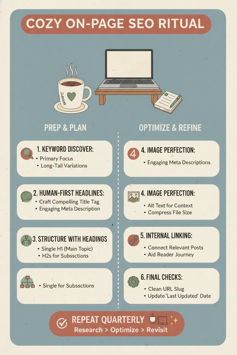 We’ve all been there: you hit publish on a gorgeous post and wonder why it isn’t getting any love. Most on-page SEO slip-ups are simple, fixable things that sneak in during the rush—writing before you do proper keyword research, stuffing the same phrase in every line, skipping unique title tags and meta descriptions, forgetting a clear H1, or piling on H2s with no real hierarchy. Then there are the sneaky culprits: images without alt text, giant files slowing the page, thin intros that don’t match search intent, messy URLs, and posts with zero internal links. Even beautiful content can feel heavy on mobile if paragraphs are too long and CTAs are buried. That’s why I like to step back and think about search engine optimization as a cozy, repeatable ritual: pour a coffee, raise your laptop stand to eye level, open your keyword research tools, and walk through a visual checklist that keeps you honest.