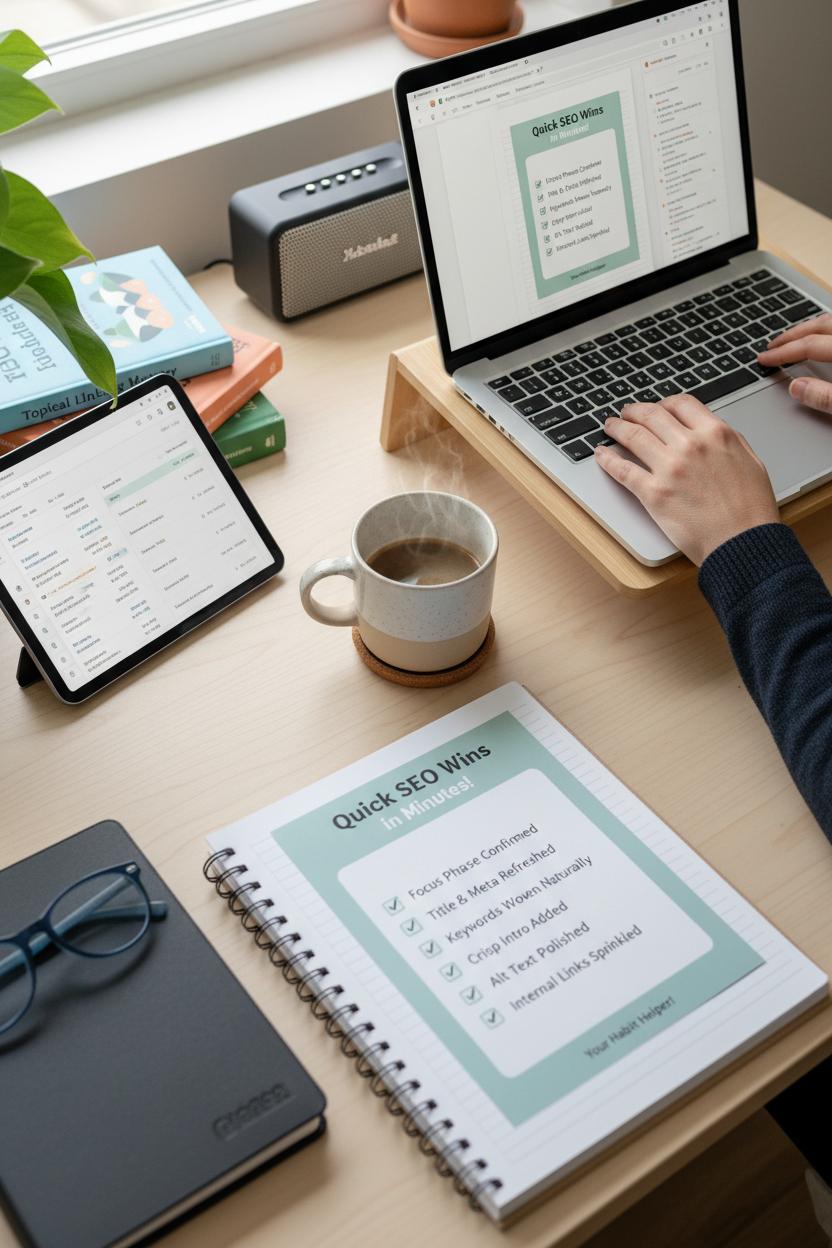 Plan once, then glide. Open your marketing planner to the page where your target pages live, then pull up your keyword research tools to confirm search intent and finalize phrasing. Keep a couple of dog-eared SEO books nearby for quick gut checks on search engine optimization fundamentals, and jot your H1, slug, and meta in the margin before you write a word. With that scaffolding in place, the draft flows. Close any tabs that don’t serve the piece. If a random idea pops up, park it in the notes—your focus is the checklist in front of you, not the entire internet. The calmer the inputs, the cleaner the output.