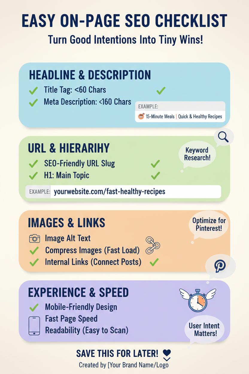E-E-A-T is your trust halo. Show real experience with first-hand examples, process photos, and results; highlight expertise with author bios, credentials, and citations to credible sources; signal authority by earning mentions and linking to your best primers; and build trust with transparent dates, corrections, and clear disclaimers where needed. Sprinkle internal links to your About page, case studies, and testimonials so your credibility is never more than a click away. When your content reads beautifully, connects thoughtfully, and proves you know your stuff, search engines and humans both lean in. Pin the SEO tips infographic for later, and let that simple on-page SEO checklist turn each post into a confident, well-lit path through your brand.