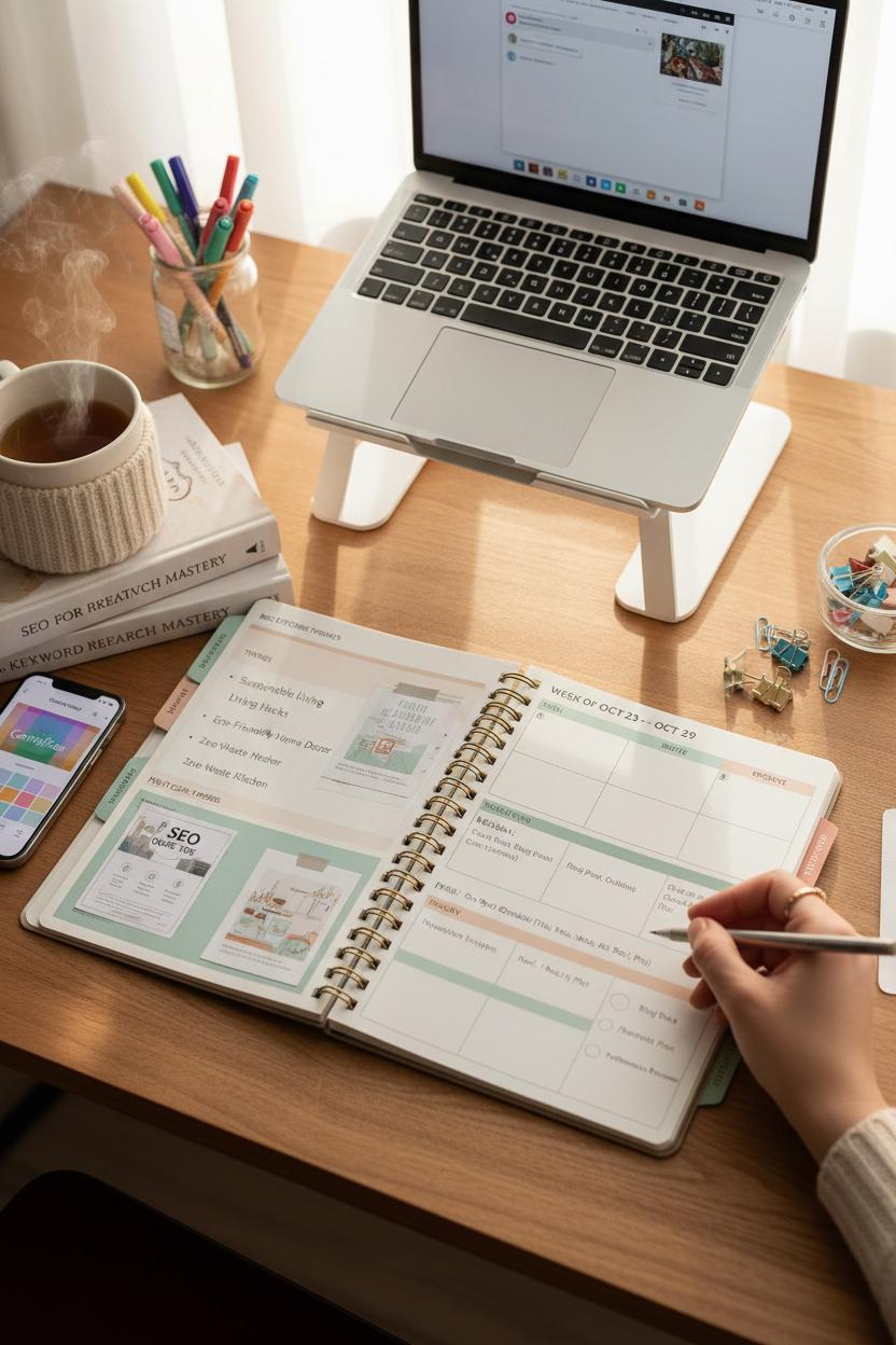 Open your planner, pour something cozy, and set your laptop on a comfy laptop stand—this is where your content calendar meets calm. Start by penciling in your big-picture themes, then tuck your SEO graphic right inside the week you’ll publish. I like to keep my favorite SEO books and keyword research tools within reach, too, so every idea is grounded in search intent and timed with purpose. With a marketing planner, you’re not just listing tasks—you’re mapping a rhythm: a place for brainstorming, a lane for writing, and a lane for polishing the details that matter for search engine optimization, from titles and meta descriptions to alt text and internal links. It’s a Pinterest-perfect spread of color tabs and streamlined focus.