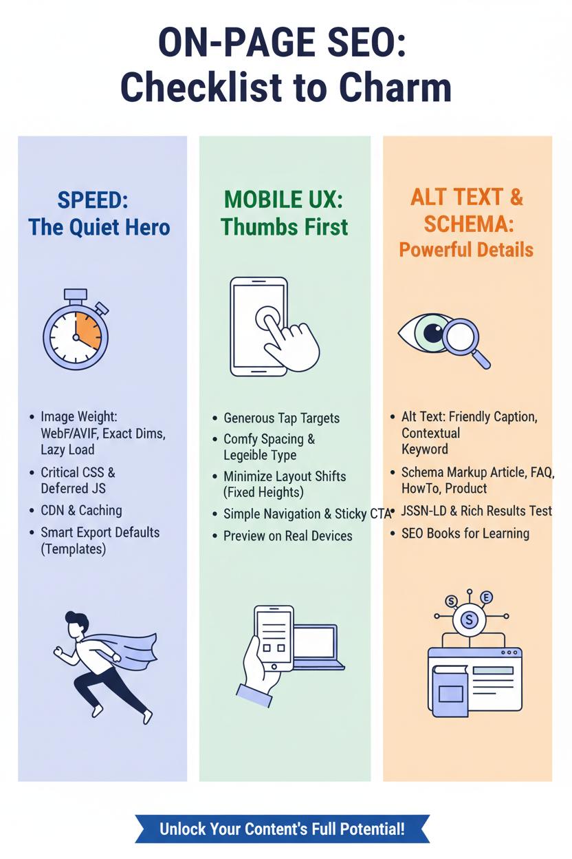 Technical On-Page Musts: Speed, Mobile UX, Image Alt, and Schema
