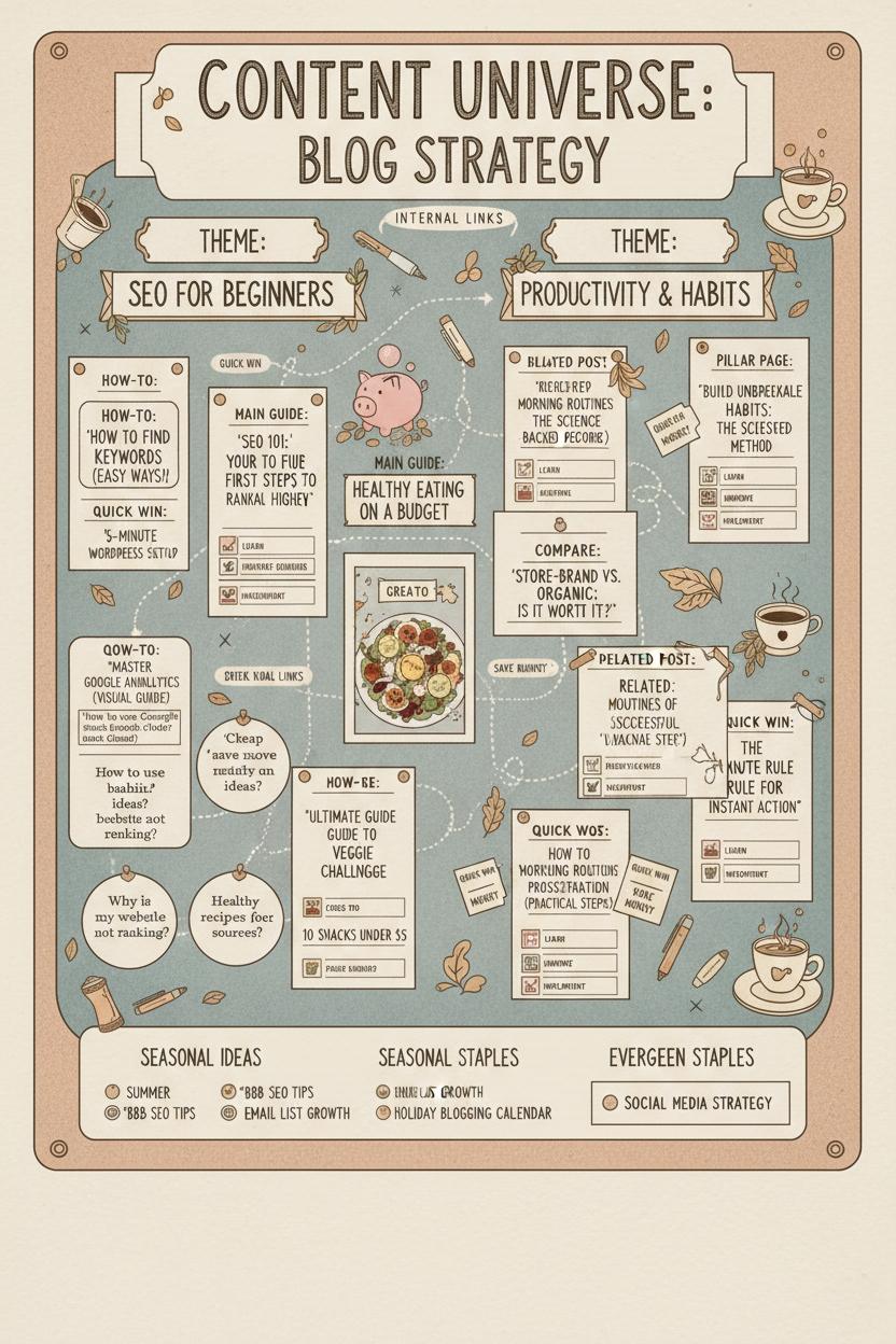 Before you write a single post, map your topics like a mood board. Open a fresh content planning notebook or your favorite blogging planner, pick three to five core themes your audience craves, and list all the questions they secretly Google under each. If you’re tackling seo for beginners, think in simple clusters: one main guide, a few how-tos, and supporting “quick wins.” Add seasonal ideas and evergreen staples, then tag each idea with search intent (learn, compare, buy) so your blog seo plan covers the whole journey. This step makes brainstorming feel creative instead of chaotic—and it gives every post a purpose beyond “just publish.”