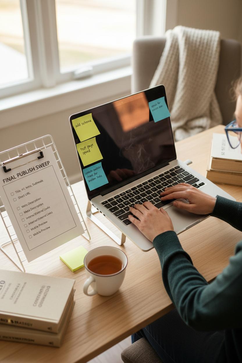 Now set the scene for consistency: keep this seo checklist printed and clipped to your desk organizer so you actually use it. I love doing the final read with my laptop stand at eye level and blue light glasses on, like a mini ritual that signals “publishing mode.” If you’re a sticky-note person, jot quick seo tips: “add schema,” “test page speed,” “update publish date,” “check for broken links,” “verify canonical.” Slip in a reminder to add a fresh featured image, craft Pinterest-friendly alt text, and sprinkle a sentence that boosts E‑E‑A‑T—your expertise, a small personal example, or a cited stat from those dog‑eared seo books on your shelf. When everything feels polished, run a last-pass grammar check, confirm accessibility basics (contrast, descriptive links, captions), and schedule a social blurb with UTM tags so you can track what actually drives clicks. That’s on page seo without the overwhelm: warm, intentional, and repeatable—ready to pin, print, and reuse for every post you publish.