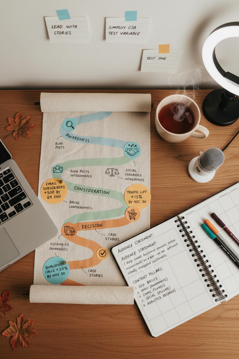 Before you sprint into content marketing, pause and picture where you want to land. What does “growth” actually look like for you this quarter—more email subscribers, steady lead generation, a bump in qualified discovery calls, or a simple, satisfying traffic lift to your cornerstone posts? Pick one main outcome and assign it a number and a date so your work has a finish line. Then map that goal to the buyer journey: awareness pieces that invite new readers in, consideration content that compares options and builds trust, and decision posts that make it easy to say yes. A clear goal keeps every caption, carousel, and blog post honest, and it makes your blog content strategy feel like a cozy, color‑coded roadmap rather than a game of content roulette.