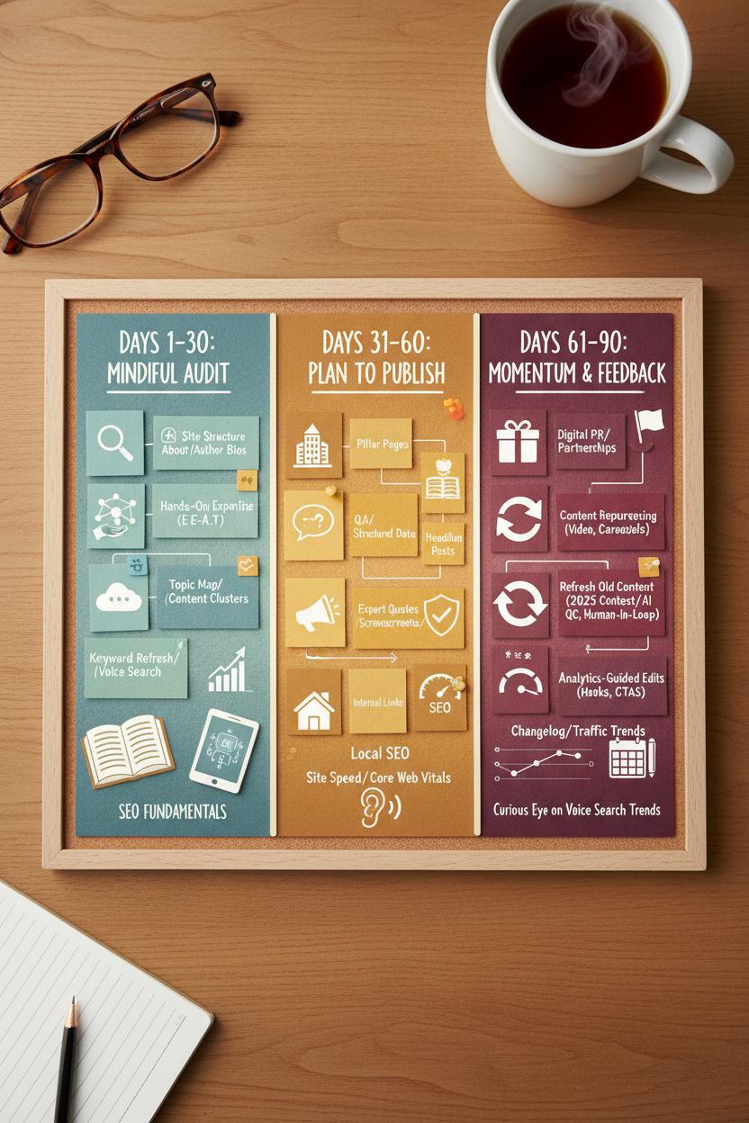 Think of the next 90 days as a cozy, color‑coded project board—one that steadily moves you toward the future of seo without the overwhelm. In the first 30 days, start with a mindful audit: tighten your site structure, refresh your About and author bios, and showcase hands-on expertise to strengthen eeat seo signals. Revisit your topic map and cluster your content around a few “can’t‑miss” themes your audience loves. Do a keyword refresh with your favorite keyword research software and note conversational queries that hint at voice search trends. Set up clean content analytics dashboards so you can see what’s actually moving the needle. If it’s been a minute, flip through a reliable SEO book to ground your strategy, then plug in a few AI marketing tools to help with ideation and outlines—just keep a human voice steering the ship.