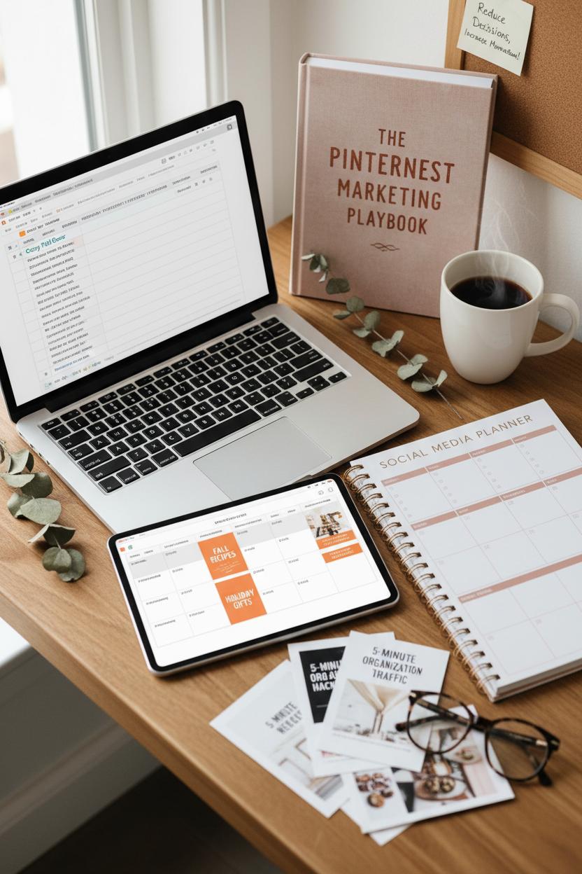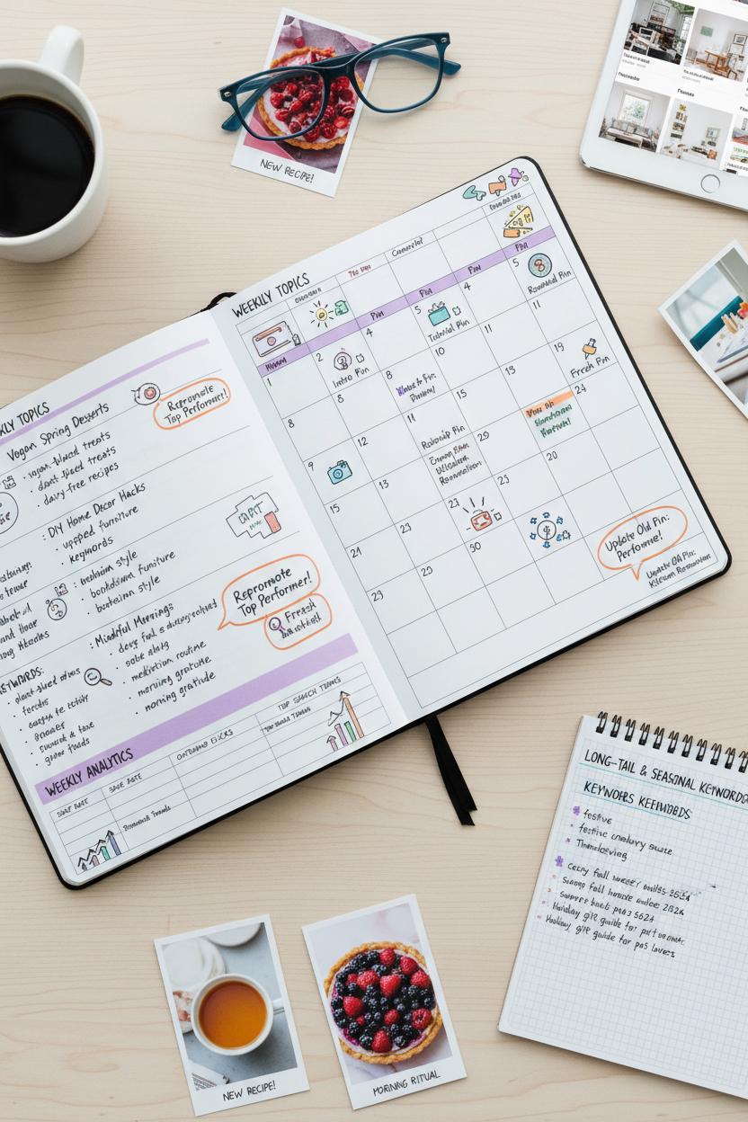 If you want Pinterest SEO to work harder for you, treat your Pins like a campaign, not a one-off post. Start by mapping everything in a social media planner and a simple content calendar so you can see themes, seasons, and keywords at a glance. Pick weekly topics, then batch-create 5–10 images around each, writing titles and descriptions with your target Pinterest keywords while they’re fresh in your mind. A keyword research tool helps you uncover phrasing your audience actually searches, so you’re not guessing. I like to keep a running list of long-tail ideas and seasonal phrases in my planner, then plug them into the calendar 45–60 days before a holiday or trend peaks. One of my favorite Pinterest tips: schedule a mix of fresh Pins, Idea Pins, and updates to proven performers so you’re consistently feeding the algorithm without burning out.