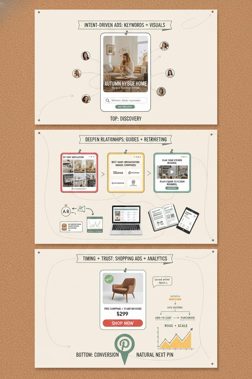 Think of the Pinterest marketing funnel like a beautiful storyboard: people arrive in discovery mode, collecting ideas and quietly shortlisting brands they’ll trust later. At the top, your job is to show up where intent lives. Use Pinterest ads to pair strong keywords with seasonal boards, trends, and lifestyle visuals that feel save-worthy. Promoted pins with interest and keyword targeting work well here, letting your brand mingle with organic content instead of shouting over it. Keep creative bright and helpful—vertical images, soft text overlays, and clear “what it is + why it matters.” This isn’t hard sell; it’s gentle intrigue. A solid Pinterest ad strategy at this stage balances reach with relevance so you seed the right people for the next touchpoint.