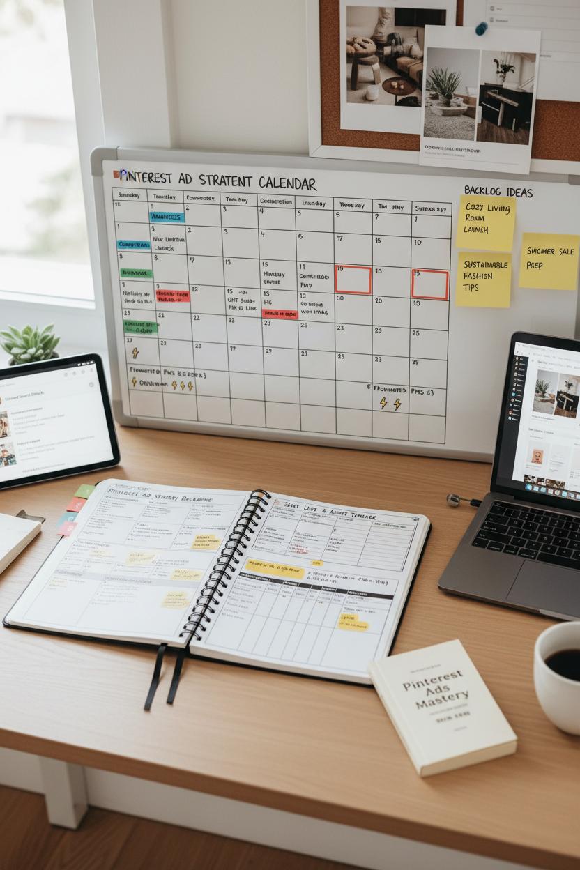 Make the calendar your command center. Add weekly reminders to review search trends, refresh hero images, rotate formats, and check budget pacing. Color-code phases—awareness, consideration, conversion—so you can see at a glance where you’re heavy or light. Keep a backlog column for pin ideas that popped up during customer calls or trend research, then drag them into future slots. If you like structured guidance, a concise Pinterest ads book or a bite-size marketing course can plug into this workflow, giving you frameworks while your planner keeps you accountable. The goal is a calm, repeatable system: ideas captured, assets created on schedule, campaigns launched cleanly, and learnings folded back into next week’s plan. Do this, and scaling Pinterest ads becomes a rhythm, not a scramble.