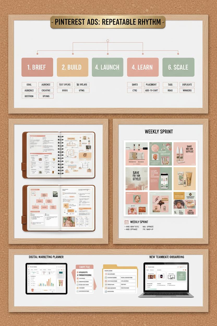 You’ve mapped your audiences, sketched budgets, and planned how to scale—now turn that momentum into a repeatable rhythm. Think of your SOPs as a cozy, well-labeled board where every pin has a purpose. Start with a single source of truth that documents your entire Pinterest ad strategy: a living “Pinterest ads book” that spells out your naming conventions, audience recipes, and testing cadence. For every campaign, capture the same steps in the same order—Brief, Build, QA, Launch, Learn, Scale—so anyone on your team can slide in and keep the magic going. In the Brief, define your goal (awareness, traffic, conversions), the primary audience (keywords, interests, actalikes), the creative angle, and the decision criteria. In Build, standardize promoted pins specs, text overlays, and descriptions; ensure your UTMs match your naming so performance reporting is seamless. QA checks placements, tags, and budgets. Launch with clear guardrails: for instance, hold 48–72 hours before judging early signals. Learn by reading saves, CTR, and add-to-cart trends alongside ROAS, then Scale in measured steps, nudging budgets and duplicating winners into new audiences.