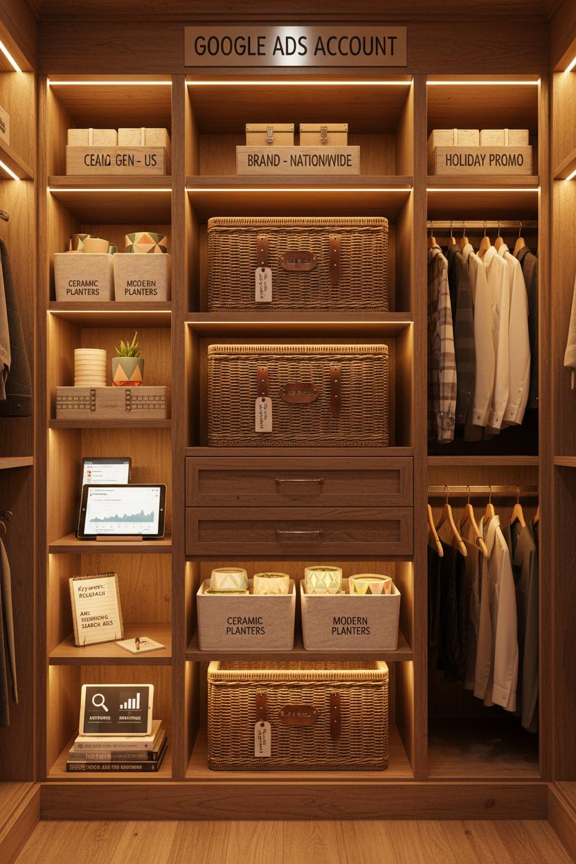 Think of your Google Ads account like a beautifully organized closet for your search engine marketing dreams. The account is the closet itself, holding your billing and access. Campaigns are the big labeled shelves—each one dedicated to a goal, product line, or audience. This is where you set your daily budget, locations, language, and bidding strategy. Then come ad groups, the tidy baskets inside each shelf, each focused on a tight theme (like one product category or intent). Inside every ad group, you pair closely related keywords with ads that read like a perfect reply to the searcher’s question. When your structure is clean, budgets stay focused, data is easier to read, and your digital marketing efforts feel a lot less chaotic.