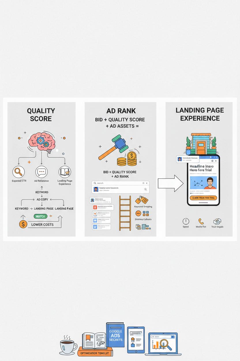 Think of Quality Score as your ad’s reputation in Google Ads, the gentle nudge that tells the platform your campaigns are helpful, on-topic, and enjoyable to click. It’s shaped by expected click-through rate, ad relevance, and landing page experience—so the clearer your message match from keyword to ad to page, the better. When you’re just getting started with search engine marketing, build small, tightly themed ad groups, write copy that mirrors real search intent, and make sure your page loads fast and feels trustworthy. A little keyword research goes a long way here: aim for terms that match your offer and your audience’s mood, not just high volume. If you want to go deeper while you sip coffee and plan your week, a beginner-friendly Google Ads book or SEM guide can make these concepts click.