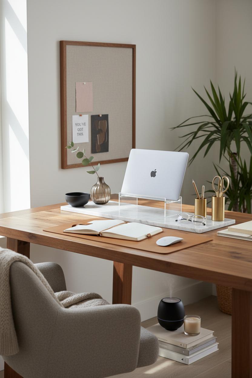 A few productivity tips to tie it all together: choose two primary colors and one accent to reduce decision fatigue; repeat finishes (brass, matte black, or chrome) for harmony; and corral everyday items on one tray so your surface stays airy. Texture is your secret motivator—bouclé for cozy focus on the chair cushion, a leather mouse pad for quiet luxury, and a soft-knit throw over the chair for late-night edits. Add a gentle candle or essential oil diffuser in a fresh fig or cedar note, and let natural light bounce off pale surfaces. Your moodboard comes to life when every detail—color, texture, and tool—whispers the same message: you’ve got this.