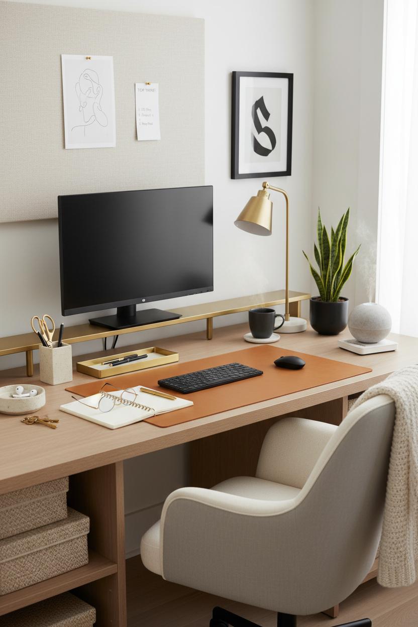 Start with a foundation that feels elevated and effortless: a clean-lined desk in matte wood or white and an ergonomic office chair with sculpted arms and real lumbar support. The palette is soft and intentional—think stone, sand, and black with a kiss of brushed gold—to channel that boss aesthetic without shouting. Lift your screen with a slim riser so your gaze stays level, then pool warm light with a petite brass task lamp. Corral the little things with gold desk accessories (a sleek tray, pen cup, and scissors set) so your surface looks styled, not cluttered. A linen pinboard or acrylic memo board keeps inspiration in view while preserving negative space, and a ceramic catchall becomes the landing pad for ear buds and keys. It’s the kind of office inspo that looks pinned, but lives like you.