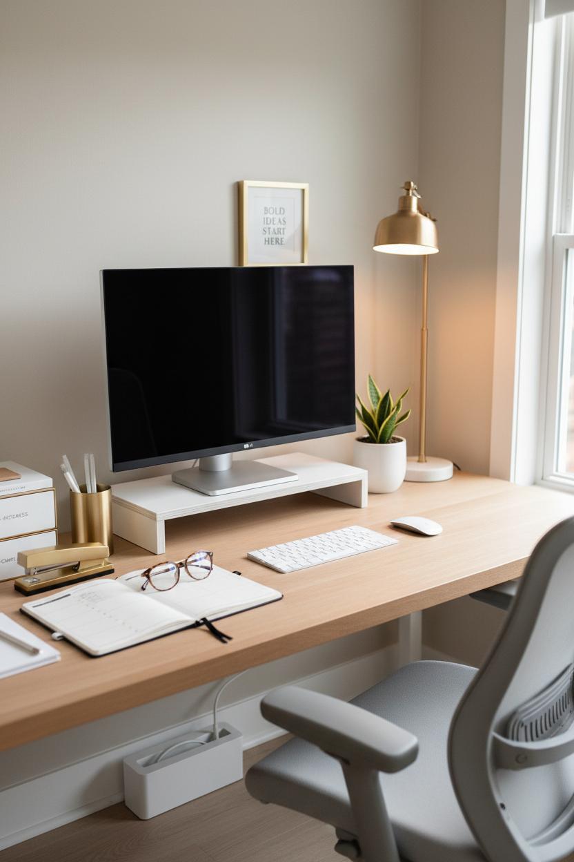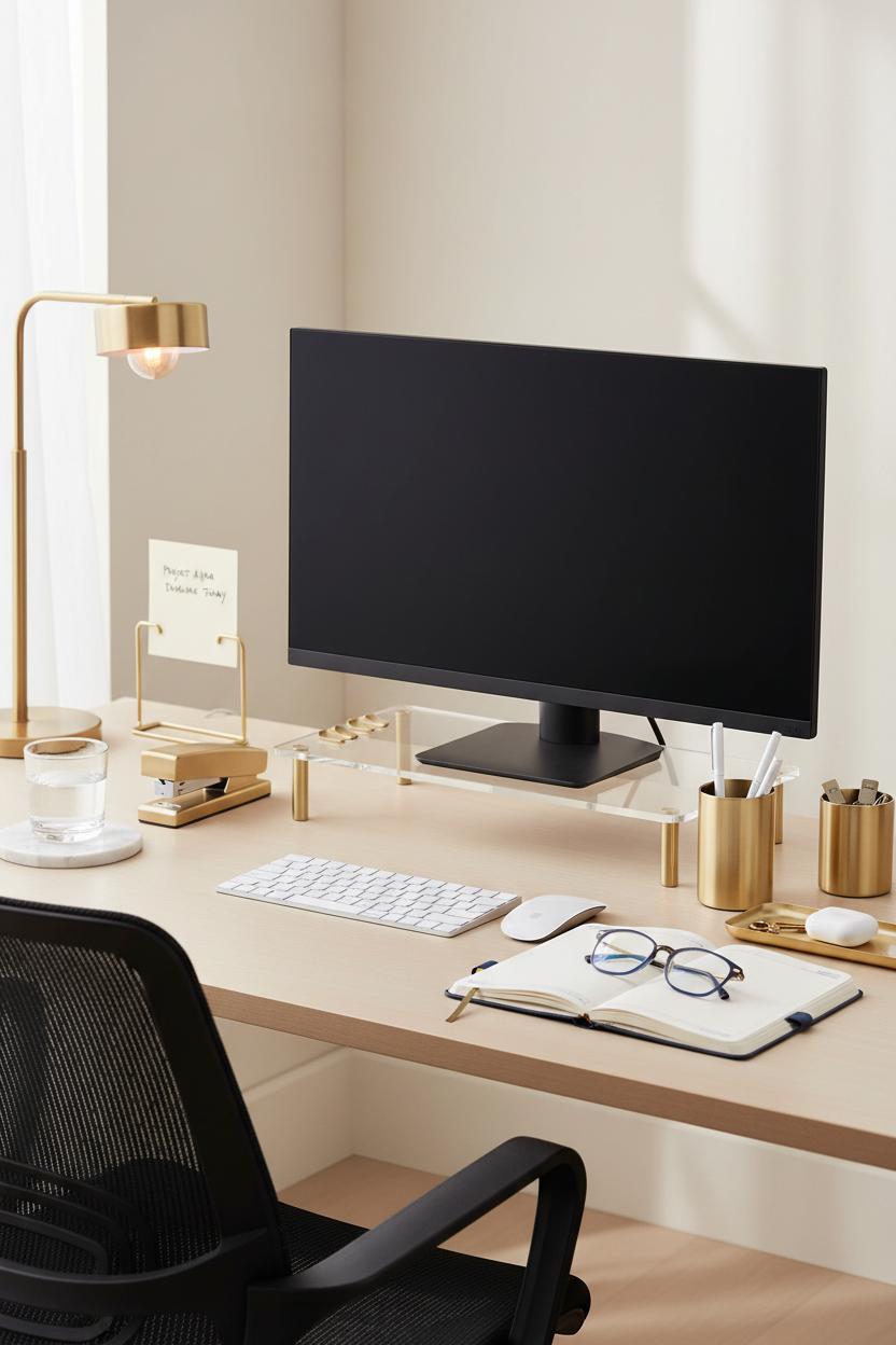 First came the foundation. I swapped the creaky seat for an ergonomic office chair that supports my posture and makes deep-focus sessions feel effortless. I raised the monitor to eye level with a simple riser and brought in a wireless keyboard to clear the surface and reduce visual noise. Cords disappeared into a slim cable box—instant serenity. Lighting was next: a warm task lamp with a daylight bulb to keep things bright but soft, and a small plant for a breath of life. With the basics feeling intentional, the styling turned the corner into true office inspo. A few gold desk accessories added subtle shine without shouting: a pen cup, a letter tray, and a slim stapler that doubles as decor. I laid out a minimalist planner open to the week so priorities live front and center, and a pair of blue light glasses rests nearby like a gentle reminder to protect my focus.