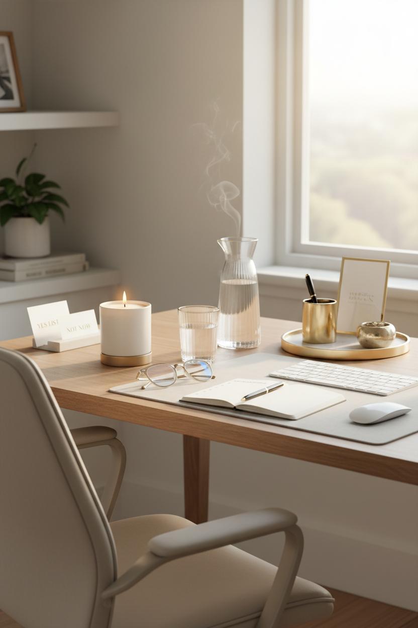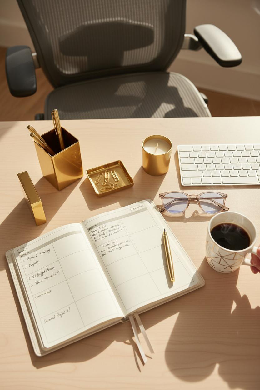 Rituals are the invisible frame around your day, and when they match your vibe, the whole picture feels more intentional. Start by setting a scene that feeds your career success aesthetic: light a clean candle, pour water into a glass carafe, cue your soft-focus playlist. Open a minimalist planner and map three priorities you’ll actually keep, then time-block pockets of deep work you can protect. Keep your desk setup streamlined with a wireless keyboard and a small tray of gold desk accessories that catch the light and your attention—only what’s beautiful and useful stays. This is the kind of office inspo that doesn’t just look good; it works hard for you. A tidy visual field equals a quieter mind, which means your ideas get the spotlight instead of your clutter.