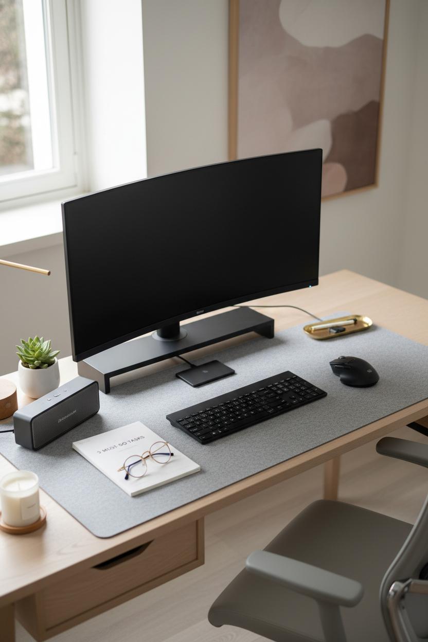 Tech should feel tactile and quiet. A low-profile wireless keyboard and silent mouse glide across a leather desk mat, easing wrists and adding visual continuity. Hide cables with adhesive clips and an under-desk tray—out of sight, out of mind, and instantly calmer. Slide on blue light glasses before long sessions to reduce fatigue, then stack a minimalist planner in cream or camel beside your trackpad to bridge digital and analog. Use it to map your “Top Three” priorities, block time for deep work, and capture quick wins. Bonus productivity tips: batch emails at set times, stand for calls, and apply the two-minute rule for micro-tasks you’d otherwise ignore.