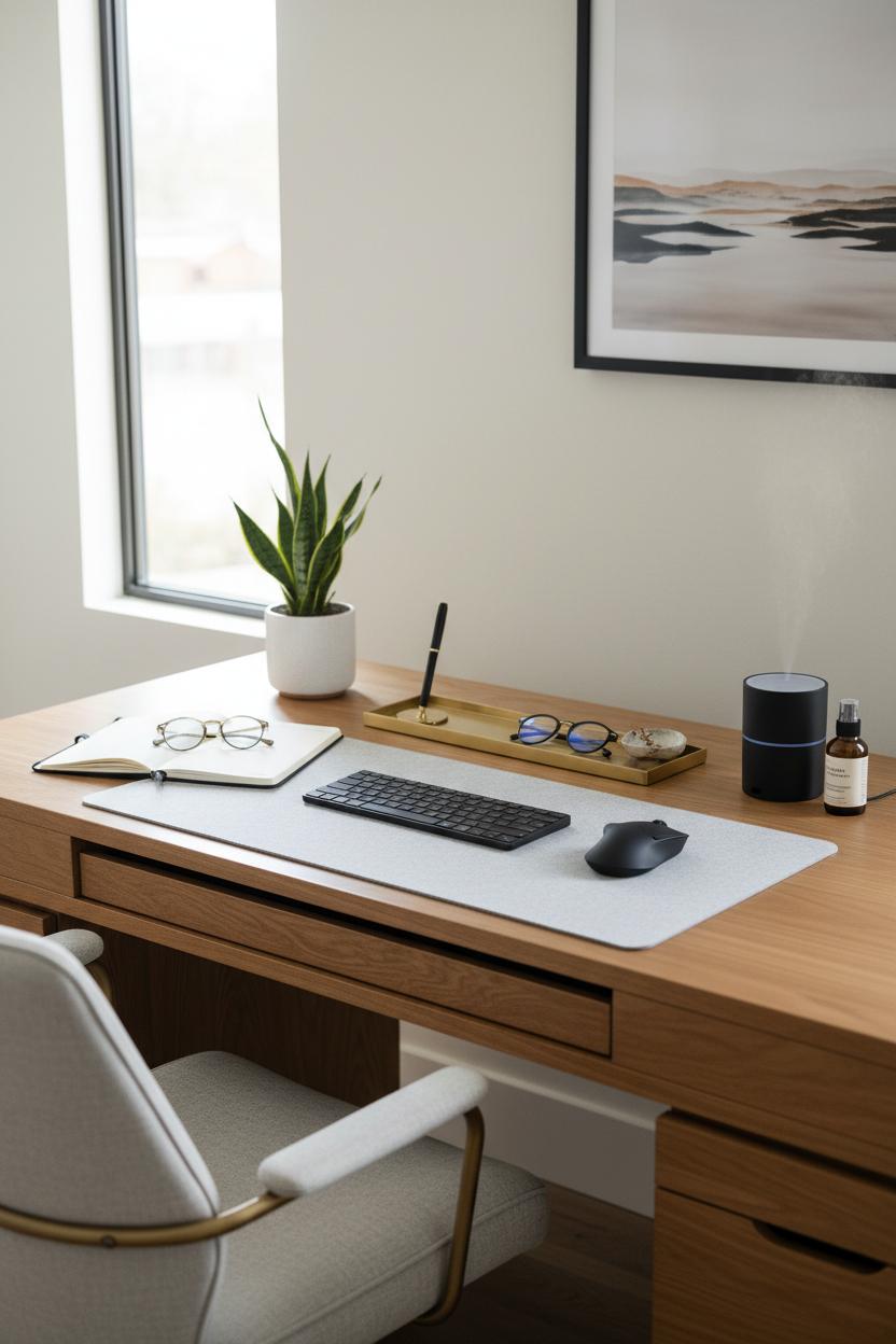 So what does that actually look like on your desk? Start with a clean surface and a visual hierarchy. Keep your essentials within natural reach and let negative space work as your built-in calm. A slim wireless keyboard, a smooth mouse, and concealed cable management make tech feel polished rather than chaotic. Pair that with an ergonomic office chair that supports your posture during deep-focus sprints; comfort is a power move. Layer in a few gold desk accessories—think a gleaming pen holder or a minimal tray—to catch light and signal intention without screaming for attention. Keep a minimalist planner open to a single prioritized page so your next action is always obvious, and tuck blue light glasses in a small dish so they’re handy when the afternoon glare hits. Add one living element (a petite plant, a sprig in a bud vase) and a subtle scent, and your workspace starts to feel like a place that holds you to your highest standards.