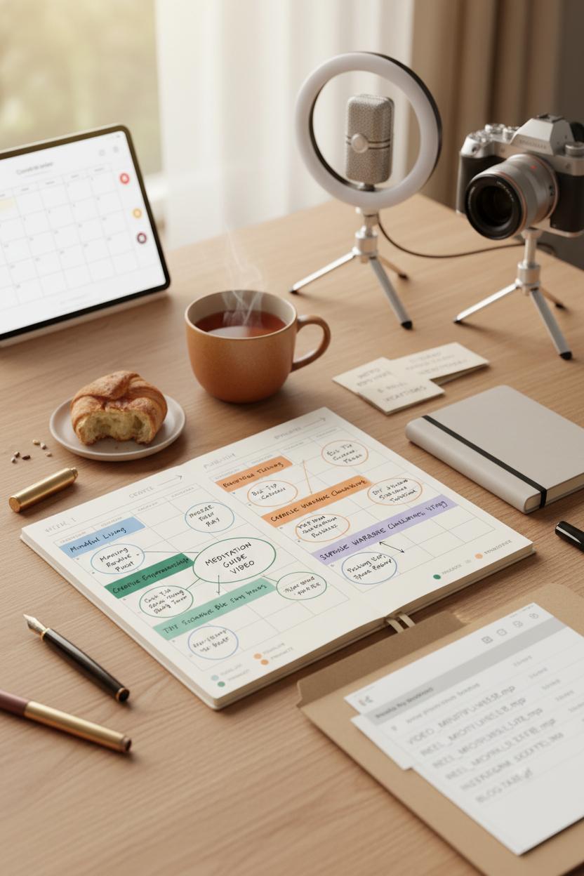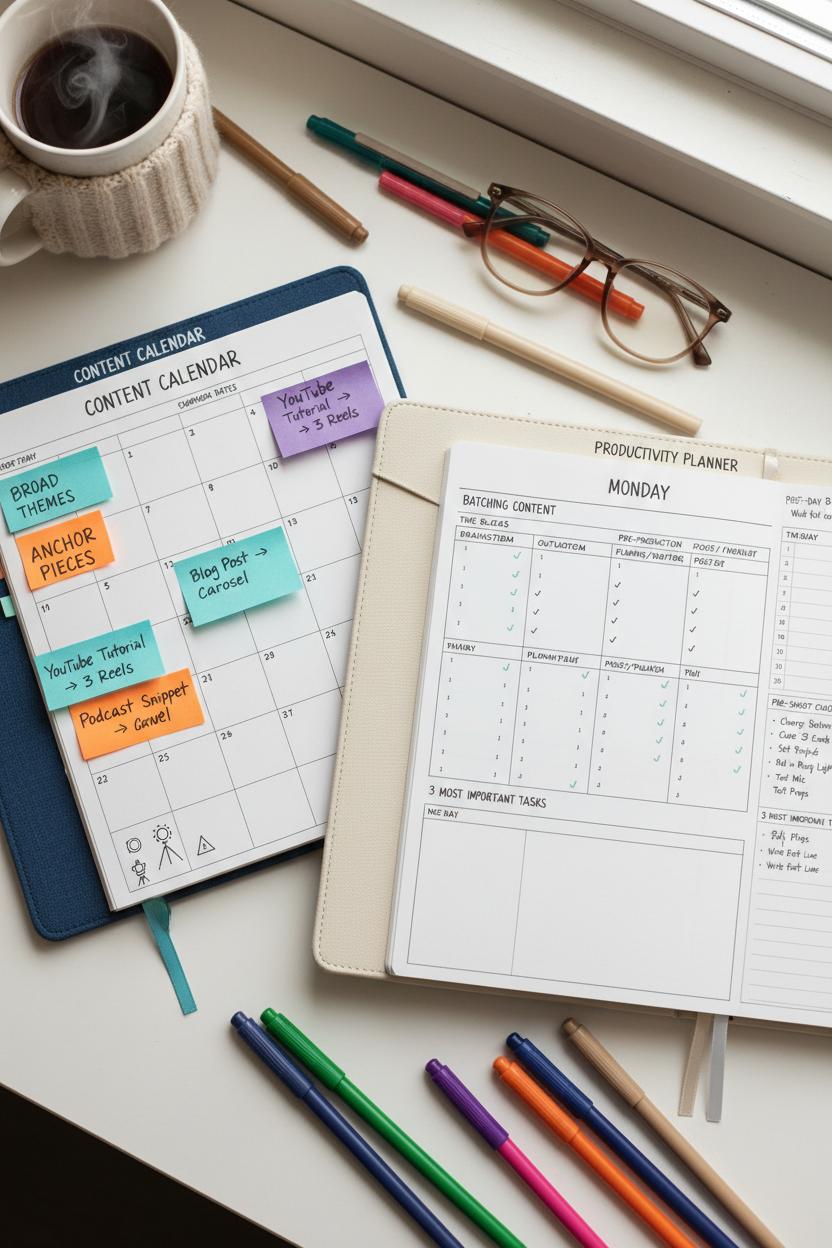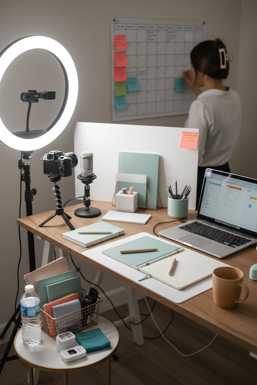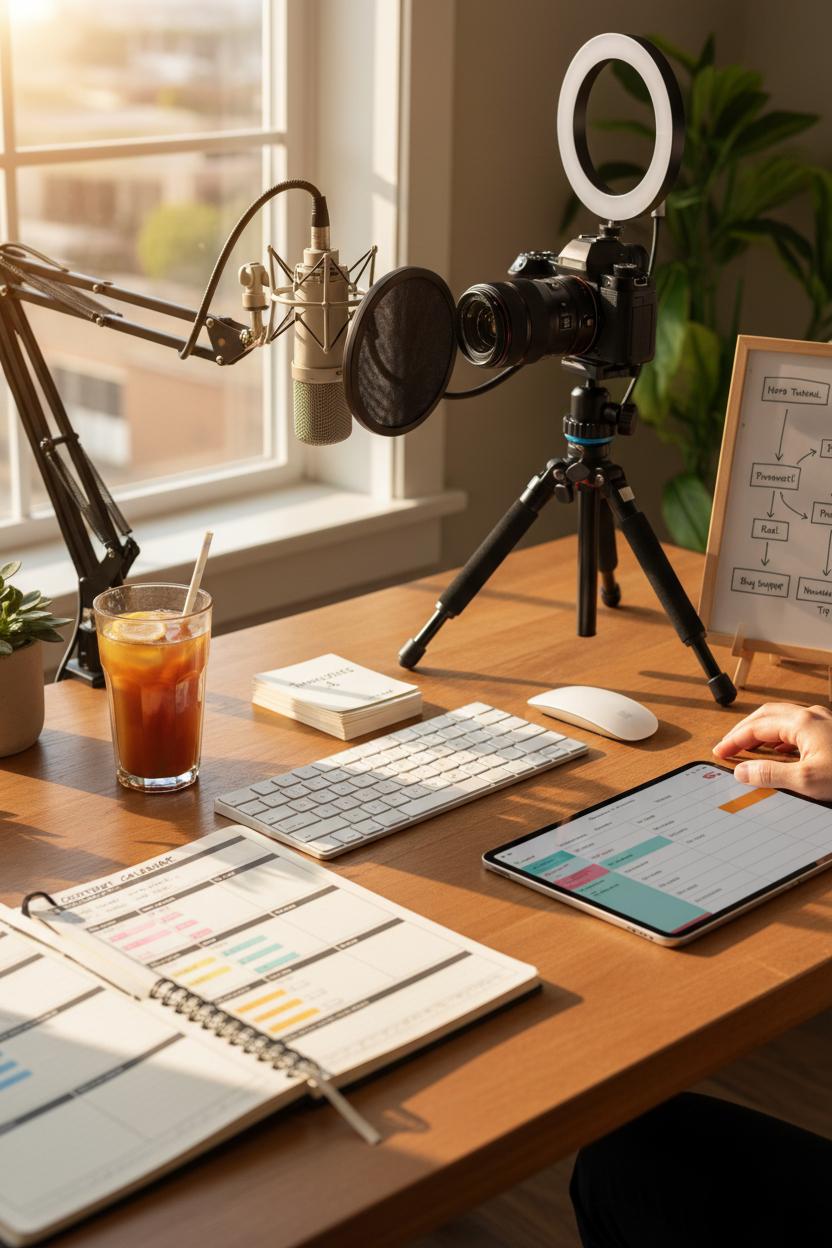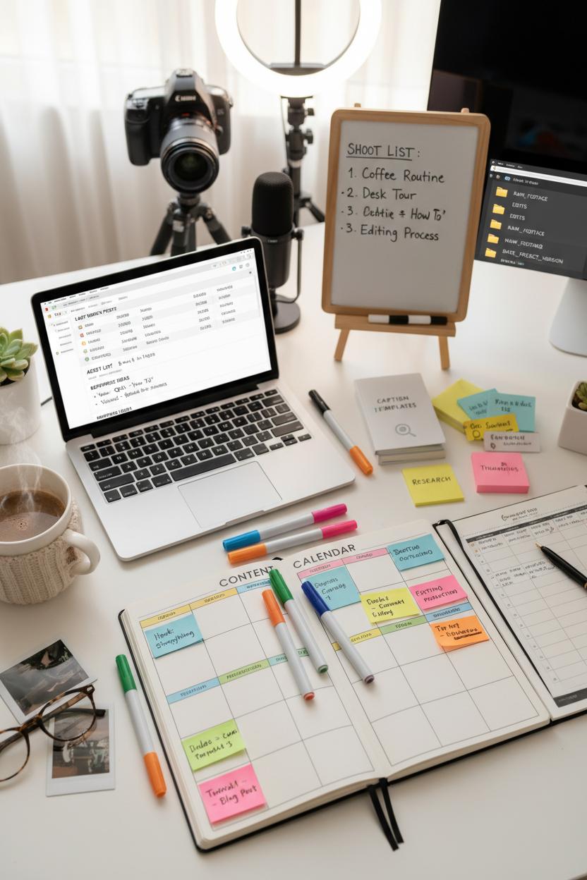 Batch day is where the magic happens—lights on, hair clipped back, water bottle filled, and your space divided into tiny, efficient zones. Start by opening your content calendar and pulling the shot list you prepped in your content calendar notebook; it keeps your energy pointed in one direction instead of ricocheting between tasks. I like to set up three stations: a talking-head corner with a ring light and camera tripod, a flat-lay table for product and process photos, and a screen-capture setup with folders pre-labeled. Hit record on your A-roll first, while you’re freshest—script beats in your productivity planner, bullet points visible, and your USB microphone tested. I record horizontal and vertical versions back-to-back so I can repurpose content later without redoing makeup, lighting, or momentum.
