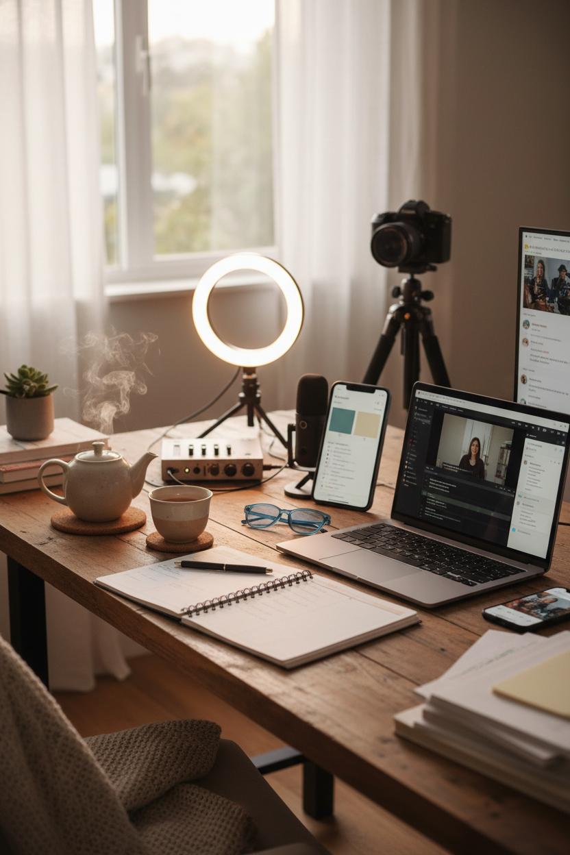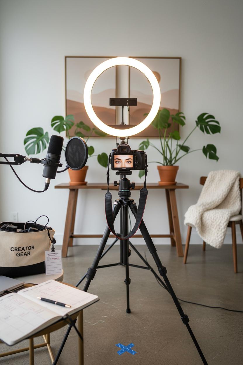 Before you hit record, set the stage with creator tools that make everything feel effortless. I start by anchoring my camera tripod at eye level and lining up a clean backdrop—plants, a textured throw, maybe a framed print—so the frame looks styled but not fussy. The point is to lock in a repeatable scene that speeds up batching content: once the tripod height, angle, and distance are dialed in, I mark the floor with a bit of washi tape so I can recreate it next time in seconds. Then I flip on the ring light and match it to the room’s vibe—soft and warm for cozy talking heads, brighter and cooler for crisp tutorials—keeping it slightly off-center to flatter without washing me out. You’ll know it’s right when shadows soften, skin looks luminous, and your eyes catch that gentle halo. This tiny ritual instantly streamlines your content production workflow because you’re not reinventing your setup every single time; you’re just stepping back into a scene that already loves you on camera.