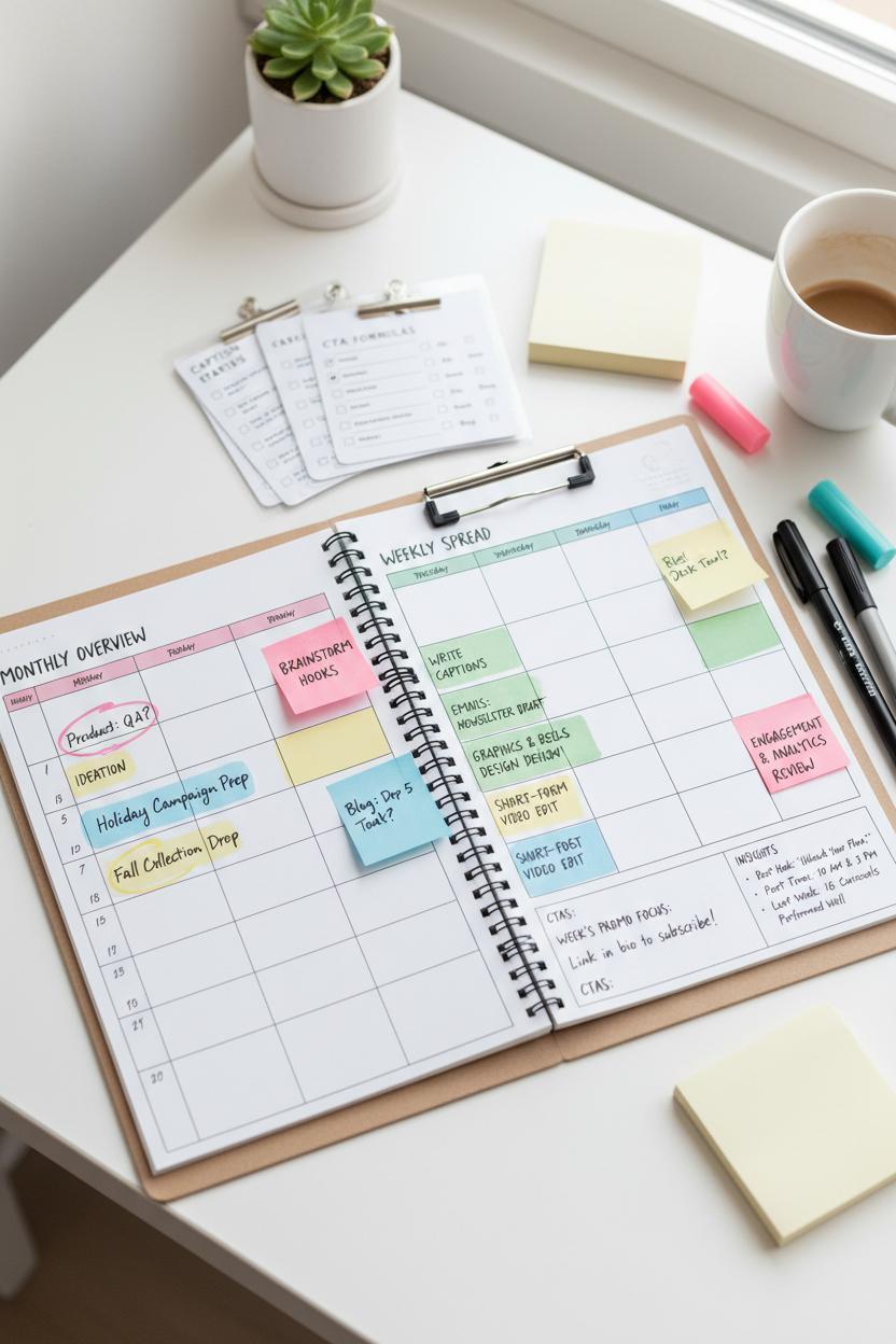 If you’ve ever sat down to post and felt your ideas evaporate, a simple printable planner can be the reset button your brain needs. Print a fresh weekly spread, slide it into a binder or clipboard, and use it as a tactile command center for batching. Start by parking your big-picture ideas in the monthly overview—think launches, campaigns, or seasonal moments—and treat that page like your editorial calendar. Then move into the week and stack similar tasks together: one block for brainstorming hooks, one for writing captions, another for graphics or reels, and a final block for scheduling. When you anchor these blocks to a clear content planning template, you’ll see how each piece ladders up to your content calendar without the stop-and-start that drains time and momentum.