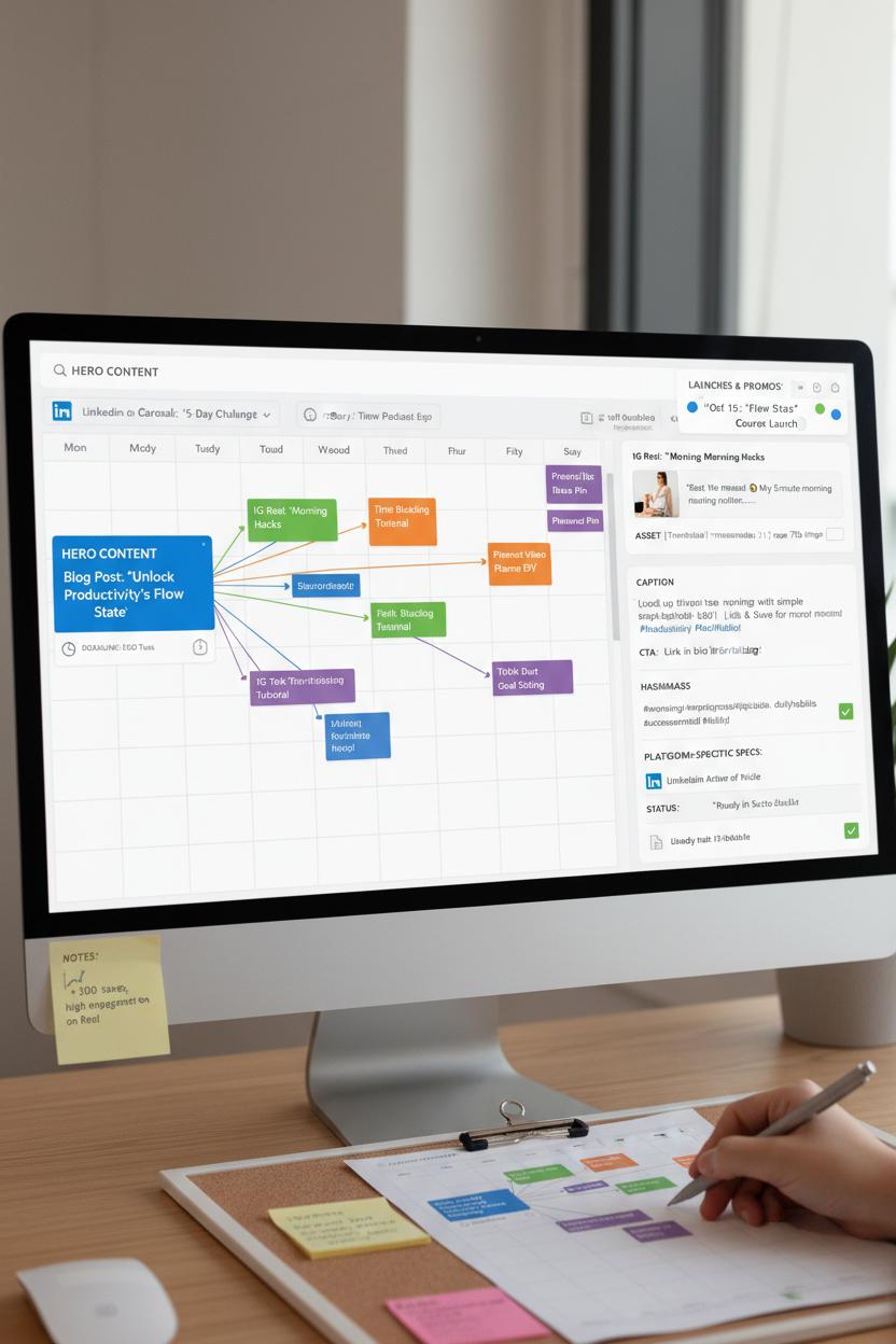 Think of this as the moment your ideas put on their going-out outfit. You’ve poured your themes and topics into a content calendar; now simply translate that plan into a social media calendar that maps what goes live where and when. Start by pulling your monthly pillars from the content planning template and assigning them to platforms—Instagram, TikTok, Pinterest, LinkedIn—then sprinkle in formats that fit each space: carousel, Reel, Pin, story, short-form video. Anchor each week with one hero piece (a blog, video, or podcast) and atomize it into bite-size posts, staggering them across the week so your audience meets the same message in fresh ways. Color-code by platform, add gentle deadlines, and your editorial calendar becomes a scroll-stopping rhythm instead of a last-minute scramble.