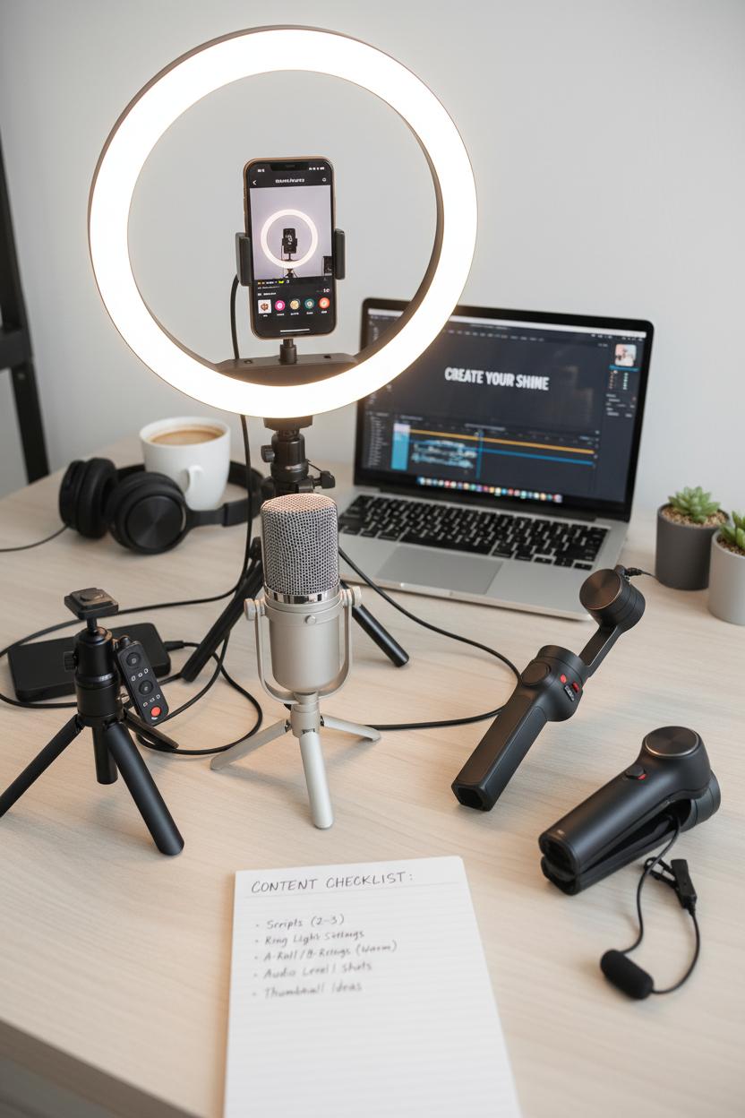 The real magic happens when you weave this gear into your content creation workflow: batch two or three scripts, set up your tripod once, lock in your ring light settings, capture a mix of A-roll and gimbal B-roll, and finish with quick edits in beginner-friendly video editing software. Keep a notes app checklist for shots, audio levels, and thumbnail ideas so your process stays cozy, repeatable, and stress-free. Start with what you have, add one upgrade at a time, and let your style evolve. Consistency, not perfection, is what grows an audience—and your starter kit is the sweetest shortcut to showing up with polish every single time.