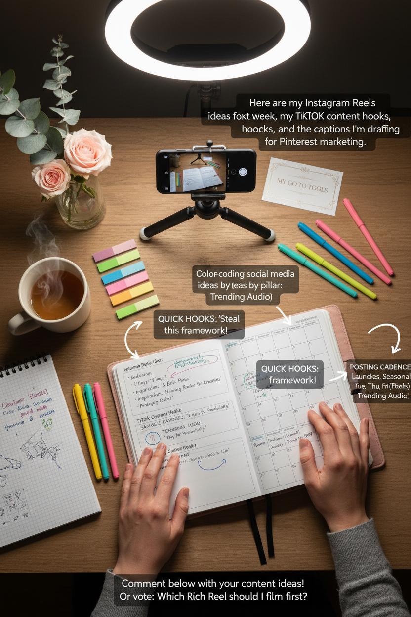 Think of this as your content cocoon where ideas can flow. Keep a content planner open next to you, with a cozy desk notebook and a few gel pens for jotting prompts, hooks, and b-roll moments as you film. You might script a quick intro, then batch three angles: a wide talking clip, a closer detail shot, and a hands-only cutaway for texture. That gives you flexibility to repurpose the same footage into Instagram Reels ideas or save vertical stills for Pinterest marketing pins. As you collect social media ideas, note what lighting and angles flatter your product, outfit, or recipe—was the ring light at 30% or 50% brightness, warm or cool? Write it down so recreating the magic is easy.