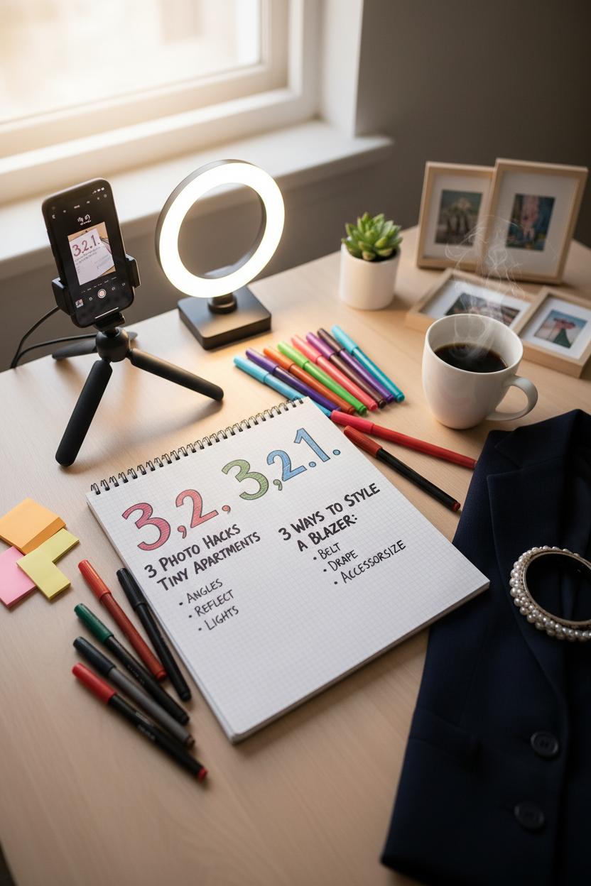 The secret sauce is pacing. Open with a hook on screen (“3 Mistakes Killing Your Reach”), then drop big, clean numbers—3, 2, 1—as you move through the tips. Use crisp text overlays and micro-demos instead of lengthy explanations. Jot your phrases in a desk notebook with gel pens beforehand so each tip is punchy and easy to read in a flash. Aim for four words or less per tip, and let the visuals carry the story: a quick cut to your screen, a hand placing a prop, a snap transition to the result. If you’re camera shy, try voiceover or captions; if you love facetime, speak directly to the lens for extra warmth. Keep audio upbeat, match your cuts to the beat, and let the countdown do the heavy lifting.