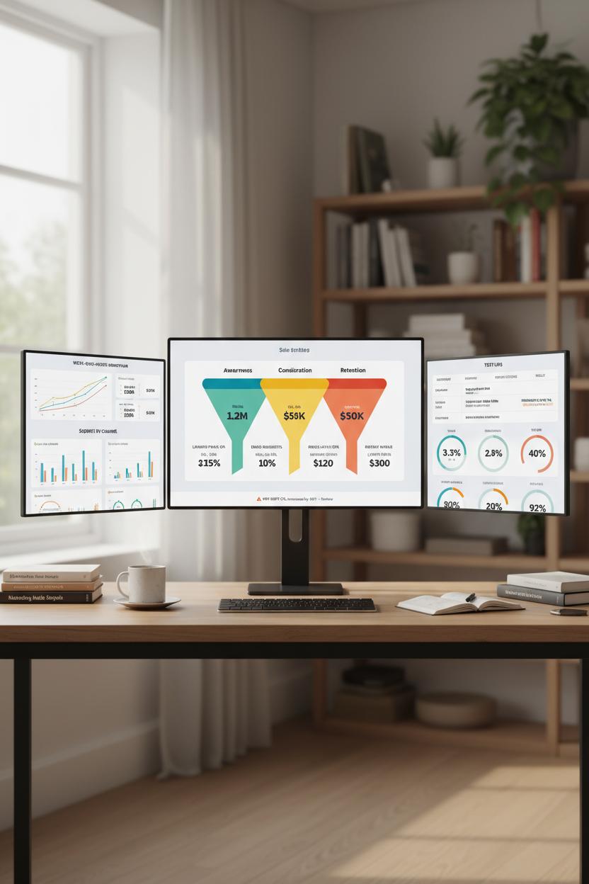 Once your marketing funnel is up and running, an analytics dashboard becomes your cozy command center—the place where every number tells a story about your customer journey. Start by mapping key performance indicators to each stage of your sales funnel so you’re not drowning in data, just tracking what actually moves the needle. For awareness, watch reach, sessions, and click-through rates; for lead generation, keep an eye on landing page conversion rate, cost per lead, and email signups. In consideration, track demo requests, MQL-to-SQL conversion, and nurture engagement. For purchase, follow checkout conversion rate, revenue per visitor, and average order value. And don’t forget retention KPIs like repeat purchase rate and lifetime value. With these essentials, conversion optimization becomes a gentle rhythm of testing, learning, and refining.