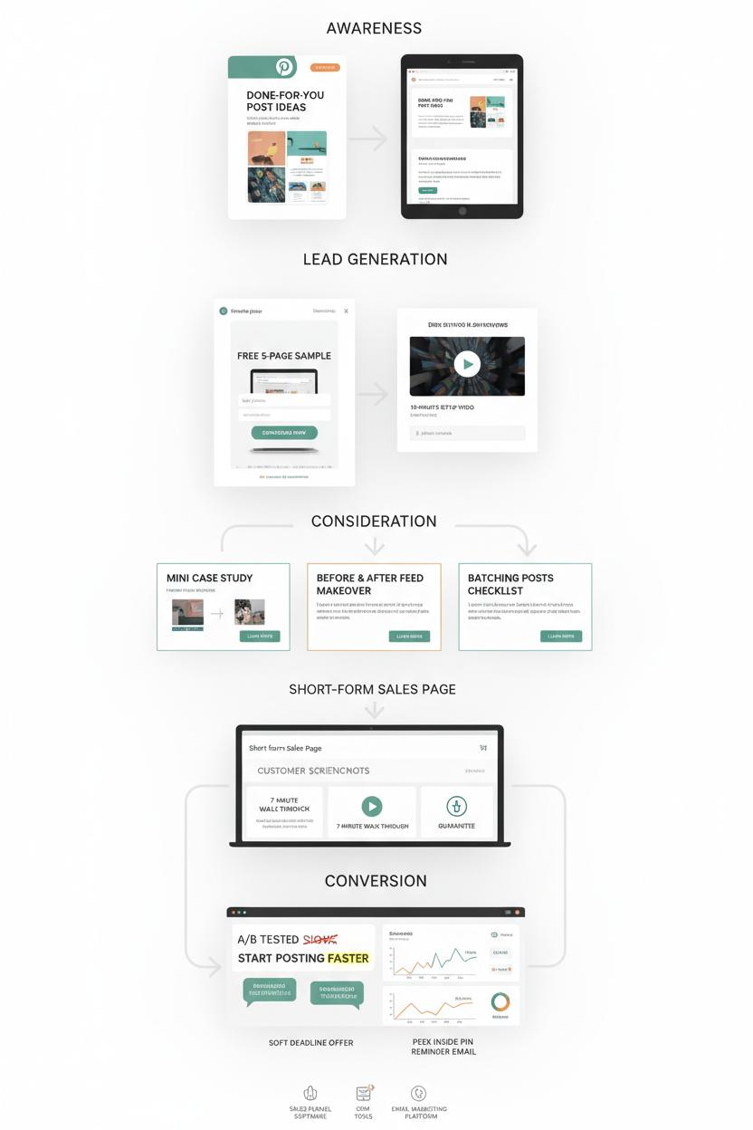 Let’s walk through a simple, real-world example: a designer selling a $29 bundle of Canva social media templates. We mapped the customer journey backwards from the purchase, asking what someone needs to believe at each step before clicking buy. For awareness, we leaned into Pinterest and a blog post round-up of “Done-For-You Post Ideas,” sprinkled with soft calls to action. The lead generation piece was a free five-page sample of the template bundle, gated behind a clean, single-focus landing page. That page lived inside our sales funnel software so we could keep the path tidy and track drop-offs. Once someone opted in, the welcome email delivered the sample plus a quick 10-minute setup video, setting the stage for success and nudging momentum forward.