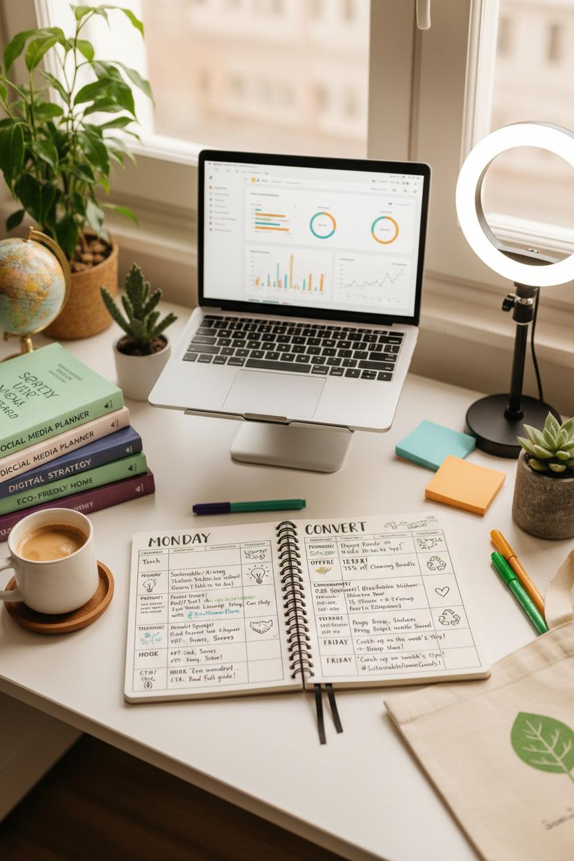 Time to cozy up with your ideas and turn them into a repeatable engine. Open your content calendar notebook, pour a coffee, and sketch the bones of a content marketing plan that feeds every layer of your marketing funnel: think awareness (educational posts, trending Reels), consideration (case studies, behind-the-scenes), conversion (offers, demos), and loyalty (UGC spotlights, tips for customers). Choose 3–5 content pillars that ladder up to your bigger digital marketing strategy, then map a weekly rhythm across your channels so your social media strategy feels consistent and alive. If you’re a tactile planner, a social media planner or even a favorite marketing strategy book on your desk can spark themes and hooks; a simple laptop stand and ring light make batch creation days feel professional and easy.