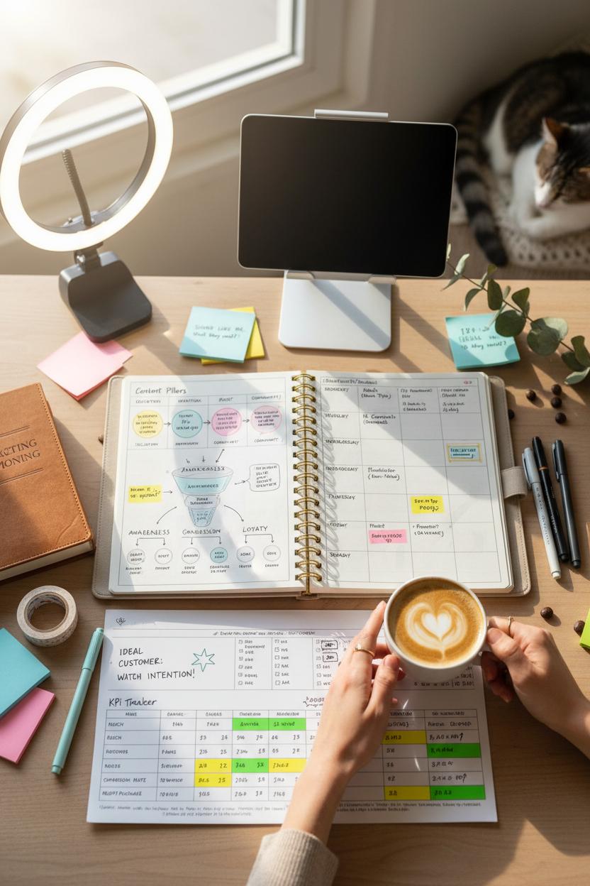 Think of this step as laying out your dream board for visibility and connection. Open your social media planner, pour a cozy drink, and map your platforms to real business goals so your social media strategy isn’t just posting pretty things—it’s guiding people along your marketing funnel. Start by listing your content pillars (education, inspiration, proof, community), then assign them to funnel stages: top-of-funnel awareness posts, middle-of-funnel trust-builders, bottom-of-funnel conversion content, and post-purchase loyalty moments. Keep your ideal customer in view—what do they need to feel, learn, and try this week? If you like prompts, a dog-eared marketing strategy book can spark positioning ideas and caption hooks that sound like you, not a robot.