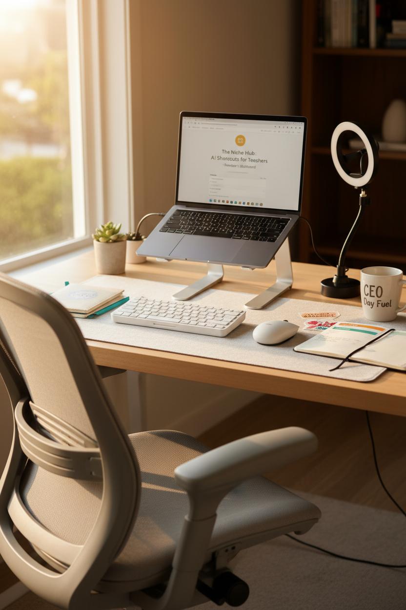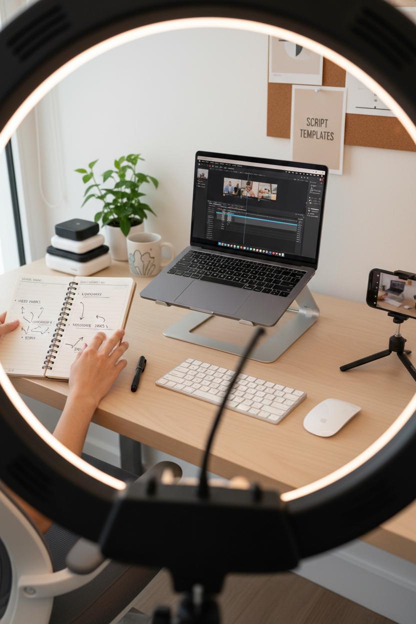 Imagine a cozy little creator corner where you never have to show your face—just your ideas. A simple ring light casts that soft, flattering glow on your hands, desk scenes, or product close-ups, while your laptop sits on a sleek laptop stand, paired with a wireless keyboard for breezy editing sessions. Comfy in an ergonomic office chair, you map out video hooks and voiceover bullet points in a well-loved planner notebook. This is the blueprint for a faceless YouTube and short-form studio that fits into tiny apartments and busy lives, perfect for anyone browsing small online business ideas or side hustle ideas that feel creative, low-pressure, and scalable.