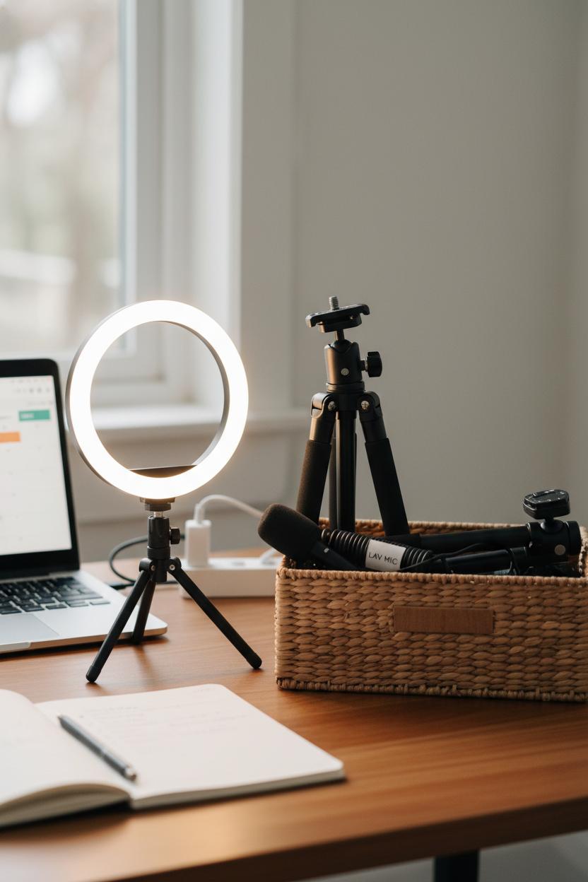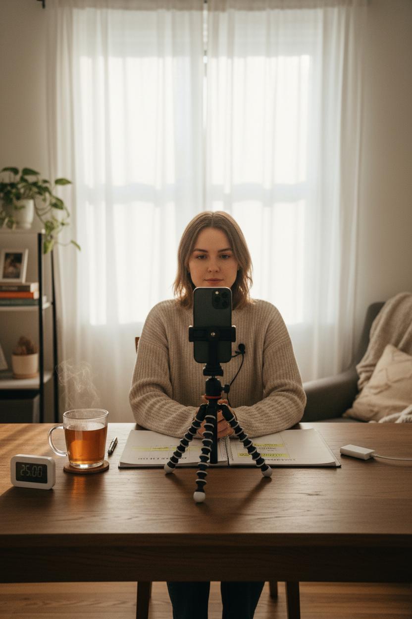 Minutes 25–45 are for fast, cozy production. Set up your tripod with phone mount, switch on the ring light, and clip on a lavalier microphone for crisp audio. Film A-roll first—tight, punchy takes—then capture B-roll of your workspace, hands, or a quick “day in the life” loop. Snap a few vertical photos for covers and Pinterest-friendly pins. Keep a sticky shot list on the desk so you don’t overthink. Leave out perfection, keep in momentum. If you need voiceovers, record three back-to-back while your energy matches.
