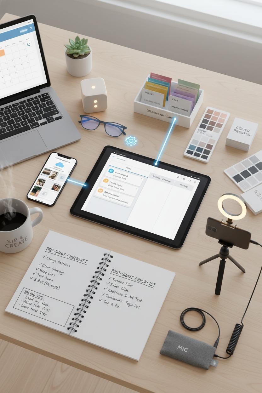 Checklists are where creator productivity becomes calm and repeatable. A pre-shoot checklist can be as cozy as it is practical: charge batteries, clear storage, wipe the lens, test audio, frame your hero shot, grab five seconds of B-roll per angle. A post-shoot checklist keeps momentum going: rename files, back up to cloud, select clips, rough cut, captions and alt text, thumbnail, tag, pin comment, cross-post. Add a quick pass for social media tips like leading with a hook, front-loading value, and a clear next step. During your 60-minute content planning session each week, pick one automation to set up, one shortcut to refine, and one checklist to simplify. Small tweaks, stacked together, turn scattered effort into a smooth, sustainable system.