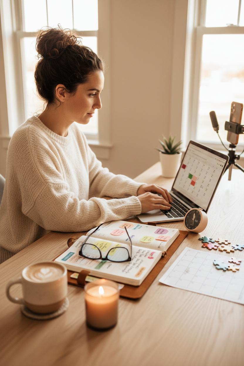 Record day is where your content creation workflow shifts from ideas on paper to cozy, camera-ready magic. Treat it like a ritual: tidy your space, pour something warm, and set a clear container of time so you can get in and out without decision fatigue. I like to glance at my content planner, highlight the shots I need, then set a time blocking timer for focused sprints. This turns filming into content batching—same setup, multiple deliverables—so creator productivity stays high and your energy feels consistent from clip to clip.