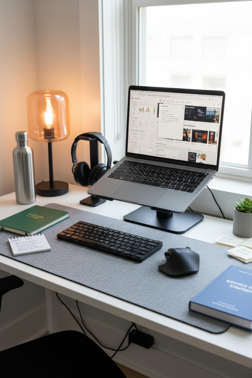 Before you dive into audits and ad copy, set up a workspace that quietly does half the heavy lifting. A simple laptop stand puts your screen at eye level so you aren’t hunching through hours of search engine marketing tasks; pair it with an external keyboard and mouse and you’ll feel your focus stretch further. Keep your essentials within reach—a water bottle, a cozy lamp, and a marketing planner notebook for quick ideas. Create a clean, single-focus zone: one browser window for data, one for writing, and one for inspiration. When you’re comfortable and uncluttered, your brain has more room for smart choices, whether you’re shaping a Google Ads strategy or checking performance spikes after lunch.