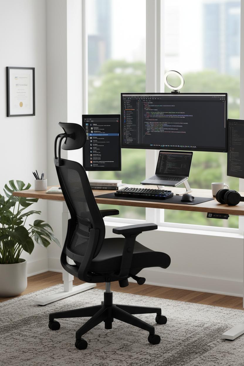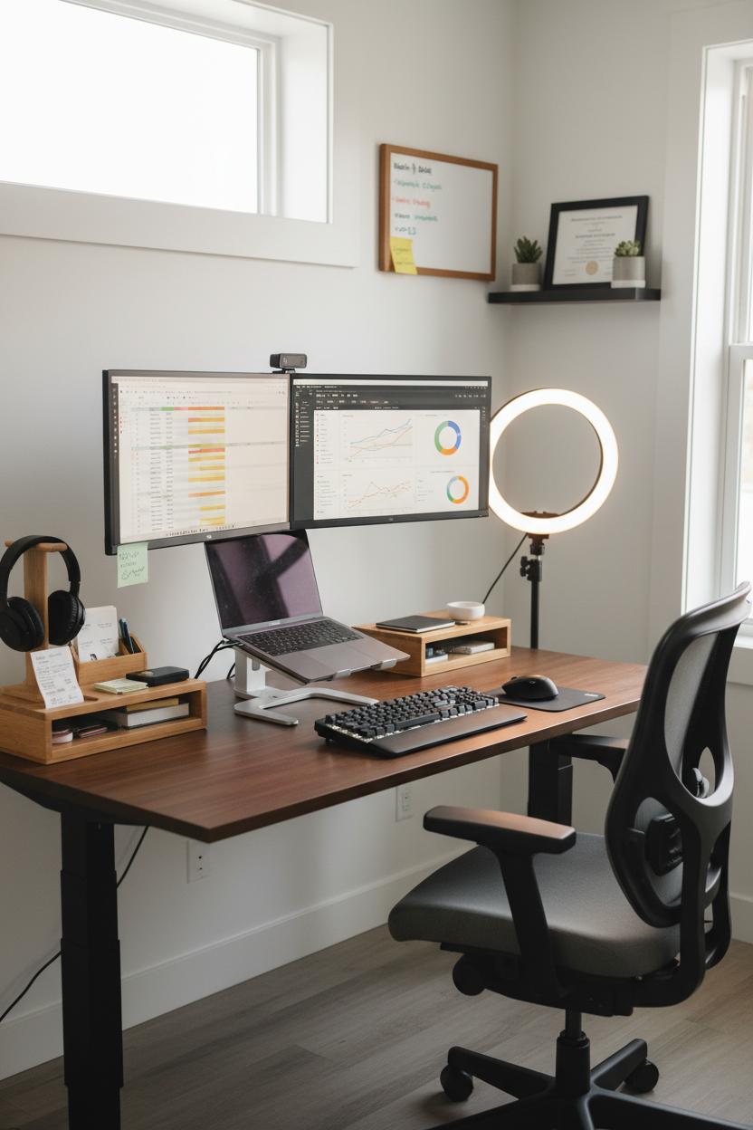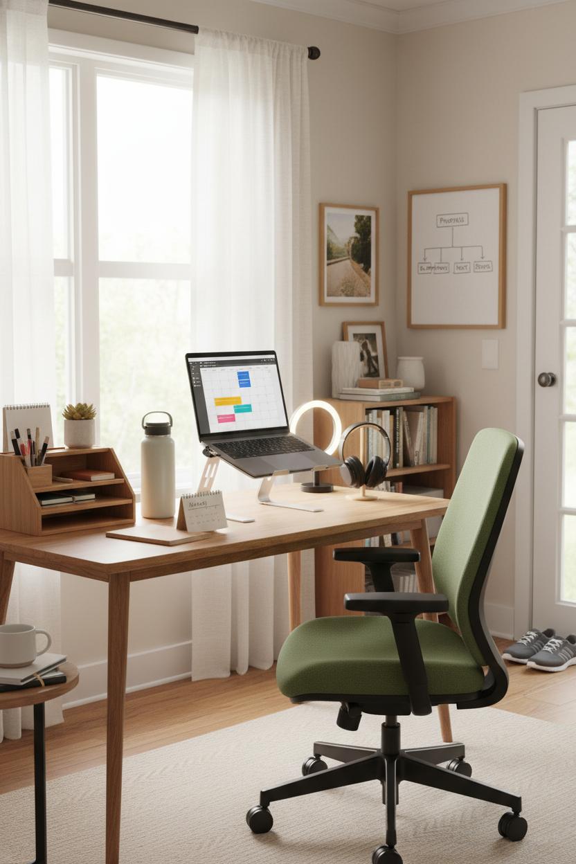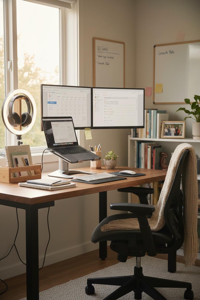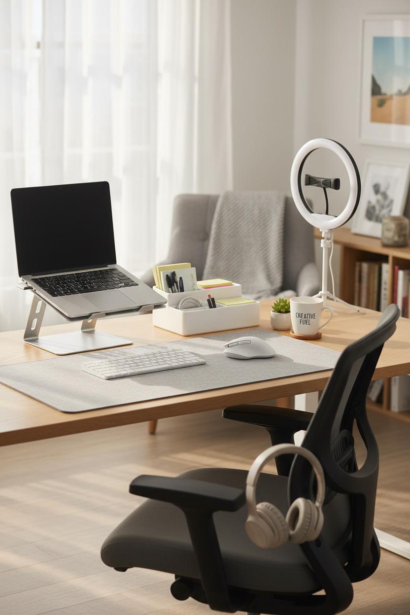 An ergonomic office chair is the unsung hero of long Zoom days—think adjustable armrests, lumbar support that hugs the small of your back, and a seat that encourages you to sit tall without fidgeting. When your body feels supported, your brain shows up sharper. A simple desk organizer keeps the visual noise at bay: pens in one place, sticky notes tucked neatly, cables corralled so your surface feels open and inviting. Add a ring light for that soft, flattering glow during calls (no more battling gloomy afternoons), and tuck in a small plant or candle to make the whole setup feel personal and inspiring.