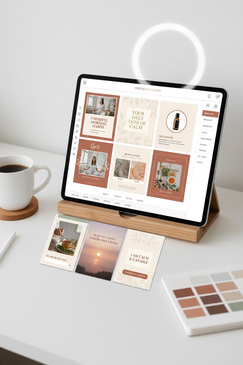 A few Canva tips make this even smoother. Start with your Brand Kit—upload your color palette, set your H1/H2/H3 fonts, add logos and signature shapes—then save your favorite layouts as reusable Instagram templates. Use frames and mockups for images so you can drop new visuals in with one click, and lock background elements to keep spacing steady. Magic Resize helps you turn a square post into a Story in seconds, and Page Titles keep your template library tidy for batching. For tactile tweaks, editing on an iPad with an iPad stylus lets you nudge elements into perfect alignment. If you shoot your own photos, a ring light and phone tripod are quiet heroes for crisp, repeatable lighting, while a desk photo backdrop creates clean, on-brand flat lays every time. Matching product hues to your template palette? A color swatch book can keep tones consistent across seasons and shoots.