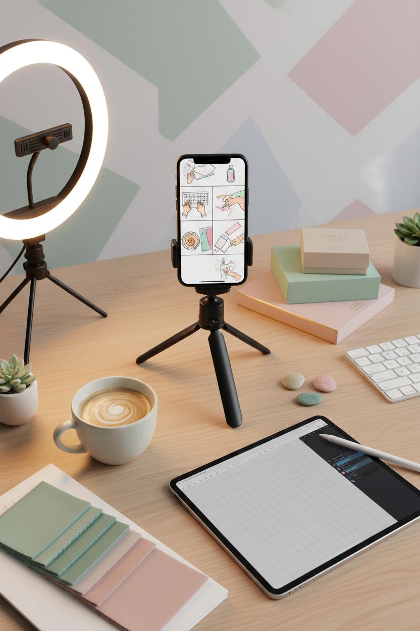 There’s a reason the reels that make you stop and stare feel so effortless: they’re stable, rhythmic, and composed like mini stories. A simple phone tripod is your secret to that scroll-stopping flow. Set your scene with a clean surface and a desk photo backdrop, pop your phone into vertical, and let the tripod hold steady while you move through the frame. Think hands gliding across a keyboard, a coffee swirl, a swatch flip, or a product “pass” into camera—small motions look luxe when they’re smooth. If you have a ring light, place it at a soft angle for that creamy glow and let your brand aesthetics do the rest: match props to your palette using a color swatch book, and keep your frame consistent from clip to clip. I love sketching a micro storyboard with an iPad stylus—five beats, five shots—so all I have to do is hit record, step in, and repeat the motion until it feels fluid.