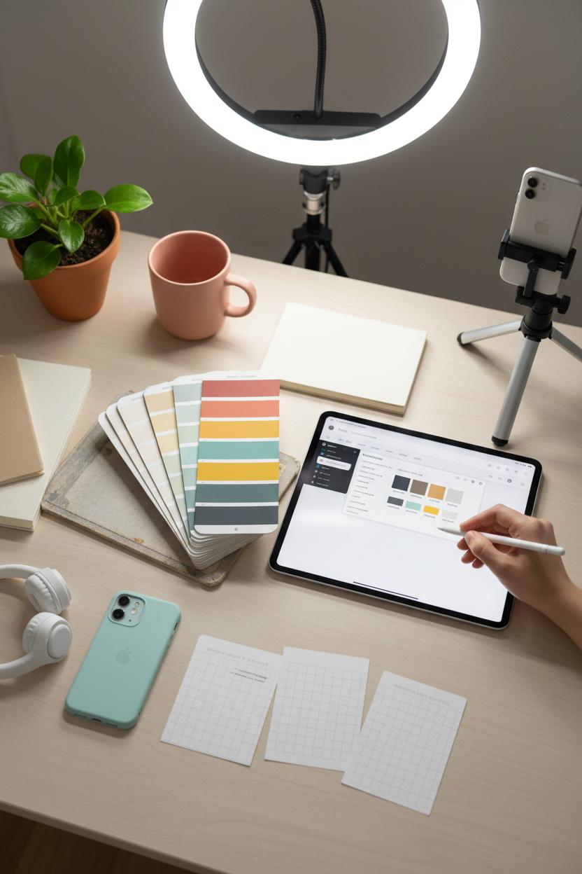 Once your palette is locked, bring it into your workflow. Use your iPad stylus to sample exact hex codes from the swatches and save them as brand colors in Canva. From there, swap them into your favorite Instagram templates to create a cohesive carousel series, quote cards, and cover thumbnails that instantly read as “you.” A few quick Canva tips: set color styles in your Brand Kit, duplicate a winning layout for consistency, and adjust saturation slightly if a photo edge needs to blend more seamlessly with your backgrounds. For content design that sells, style a handful of recurring props that match your palette—think notebooks, mugs, foliage, or tech accessories—and batch shoot with a phone tripod so your angles stay consistent while you switch out items. You can even tuck the color swatch book into flat lays as a chic prop, reinforcing your brand aesthetics in-frame. The result is a feed that feels curated yet effortless, where every post hums in the same key—and that harmony is what makes people stop, save, and come back for more.