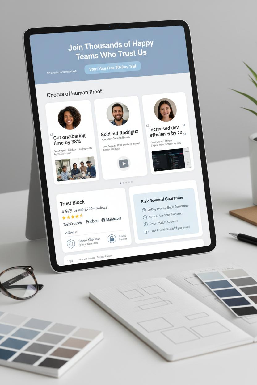 Now, lower the risk. Spell out your guarantee in plain, friendly language: 30-day money-back, cancel anytime, price-match honored, fast support. Put it directly beside pricing and forms, and borrow microcopy that soothes: “No credit card for the trial,” “Full refund, no questions asked,” “Keep your work if you cancel.” That’s UX for marketers—reducing anxiety at the exact moment commitment is asked. If you’re mapping a refresh, here are practical website redesign tips: sketch testimonial modules and guarantee bars in a wireframe sketchbook, use landing page templates to test layouts quickly, and choose reassuring hues with color palette cards (soft blues and balanced neutrals work wonders). A good web design book or UX design book can spark layout ideas and sample scripts for high-trust microcopy. As you iterate, A/B test the headline of your best testimonial, the placement of your risk-reversal line, and the size of your review count. Keep legal details a click away, but summarize the promise up front. The goal is a page that feels like a handshake—confident, warm, and unmistakably credible.