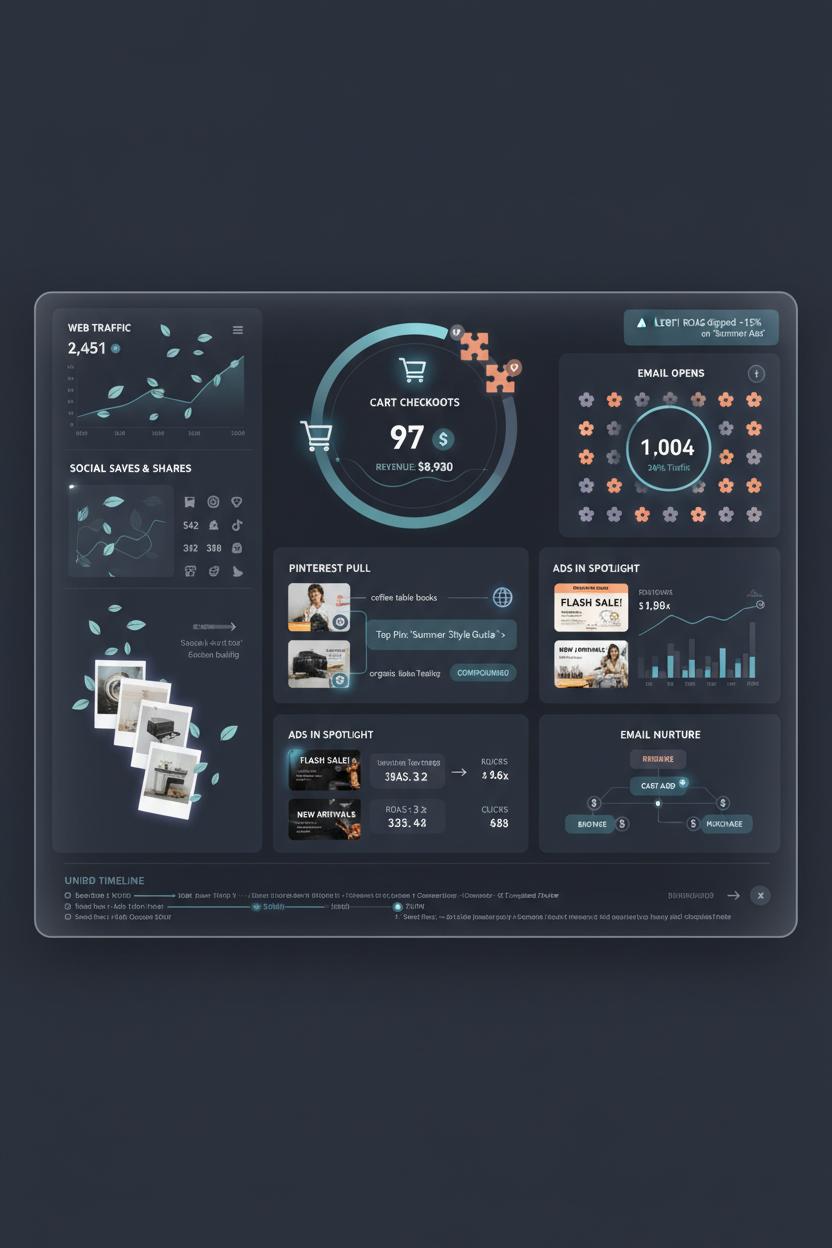 Imagine opening a single screen and seeing your brand’s whole day unfold like a live mood board—web traffic fluttering in, social saves and shares stacking up, cart checkouts clicking into place, and email opens blooming in real time. That’s the magic of a modern analytics dashboard, the kind of digital marketing software that turns scattered numbers into a story you can actually act on. Instead of hopping between tabs and screenshots, your most important signals pool into one calm, color-rich view: which pins are pulling people to your site, what search terms are quietly compounding, which ads are stealing the spotlight, and how your email marketing platform nudged browsers into buyers. For small business marketing especially, this clarity is oxygen—one glance and you know where to spend, what to pause, and which creative deserves a second life.