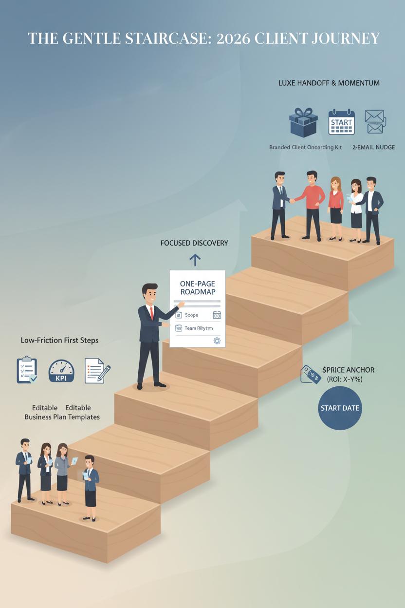 Conversion in 2026 is a gentle staircase. Offer a low-friction first step like a 10‑minute audit, a KPI scorecard, or editable business plan templates; follow with a focused discovery and a one‑page roadmap that outlines scope, milestones, and the team rhythm you run in project management software. Make the handoff feel luxe: a branded client onboarding kit, crystal‑clear timelines, and success metrics that tie back to their board deck. Keep momentum with a two‑email nudge sequence, a pricing anchor plus an ROI range, and a simple “start date” button. That’s how curious scrollers become confident buyers—and how your client acquisition engine compounds, calmly, quarter after quarter.
