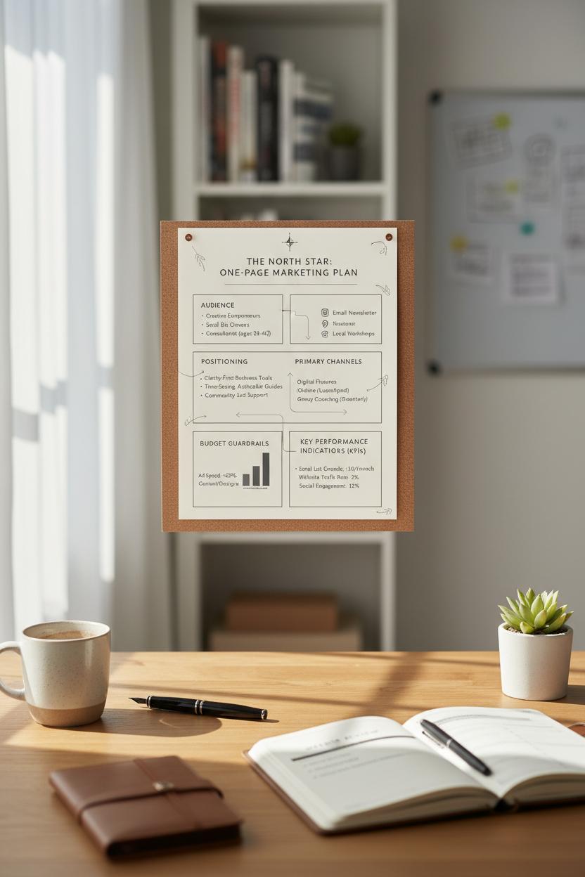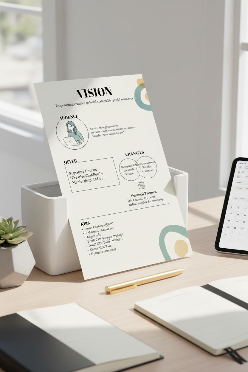 Finally, circle your KPIs—the handful of numbers that tell you if it’s working. Think simple and actionable: leads captured, email click-through, cost per acquisition, conversion rate, repeat purchase rate, or organic traffic. Decide where each number lives, how often you’ll check it, and what you’ll do if it moves up or down. When Vision, Audience, Offer, Channels, and KPIs are captured on one page, you have a living business marketing plan: a calm, clear compass that guides every post, pitch, and promo.
