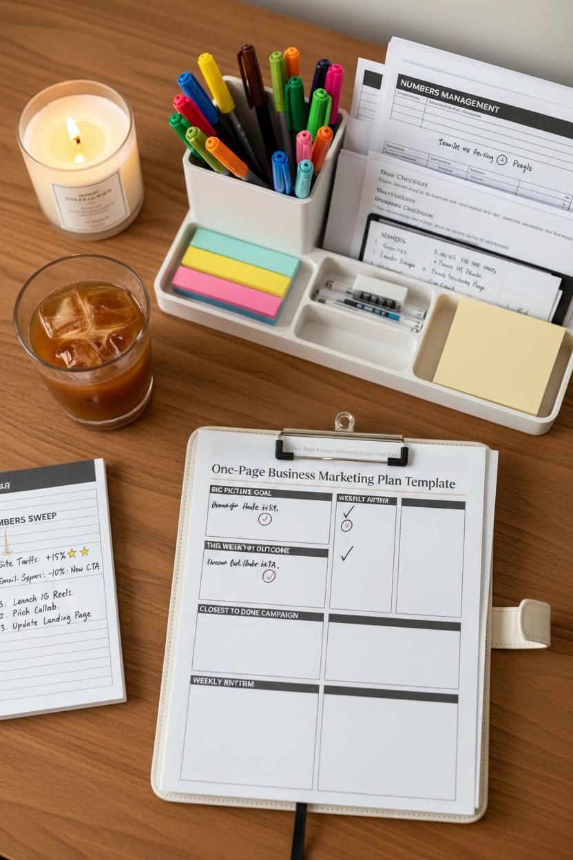 Light a candle, pour a favorite drink, and pull your productivity planner front and center. I like to keep my One-Page Business Marketing Plan Template clipped to the first page, so my weekly review starts with a quick glance at the big picture. What’s the single outcome that would move small business growth this week? What campaign is closest to done? With your desk organizer keeping pens and sticky notes at the ready, check off wins from last week and circle the places you stalled. The point isn’t perfection—it’s rhythm. You’re teaching your brain that every seven days, you return to your business marketing plan, breathe, and realign before the week sweeps you away.