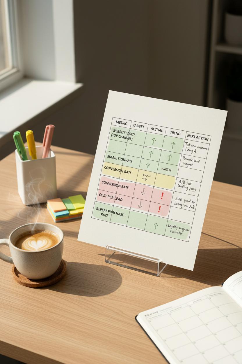 Think of your Simple Metrics Dashboard as the calm, pretty little scorecard that lives right on your one-page business marketing plan—the place you glance at with your morning coffee to see what’s working. Keep it intentionally minimal: three to five numbers that tell the real story of momentum. Choose metrics that match your goals and go-to-market plan—website visits from your top channel, email sign-ups, conversion rate, cost per lead or sale, and repeat purchase rate are a gorgeous, no-fuss starter set. Update them weekly during a short check-in; treat it like a Sunday reset ritual. When the numbers move, you’ll feel it in your bones. When they stall, you’ll know exactly where to tweak.